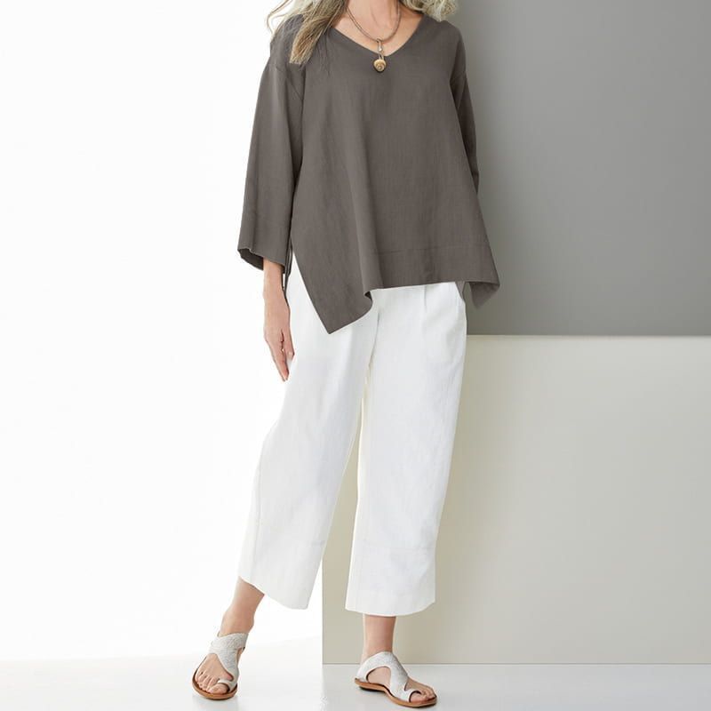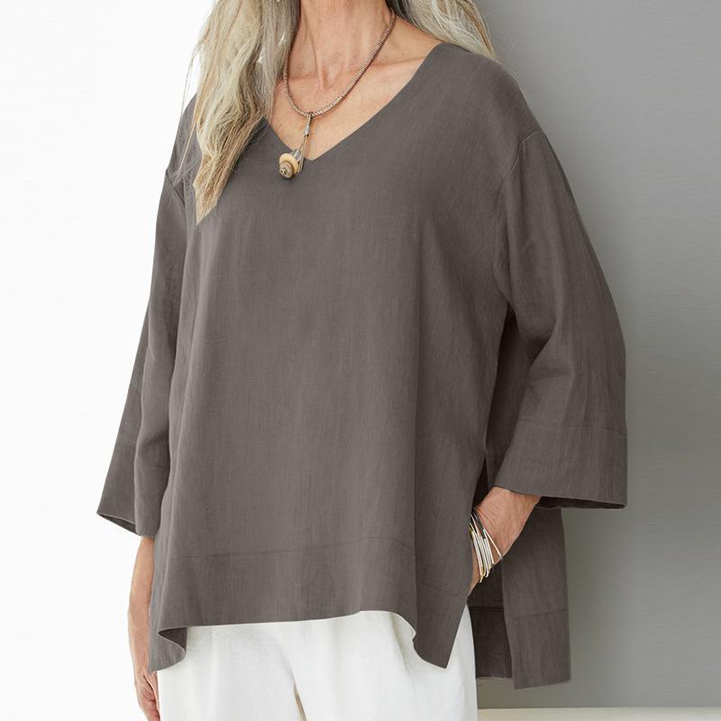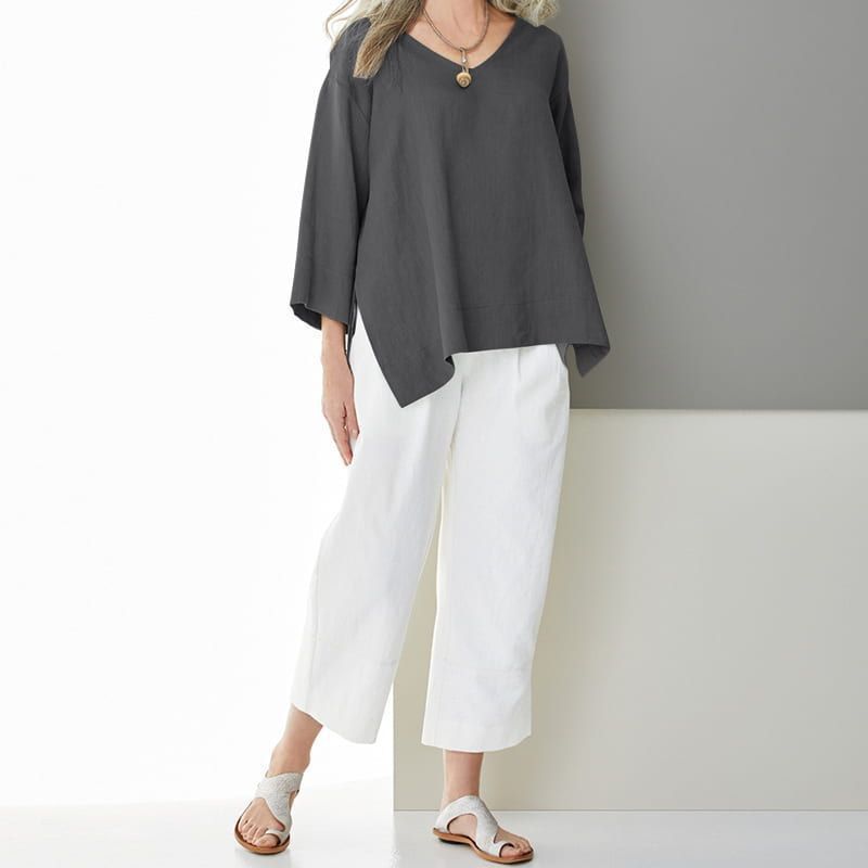 Главная страница > Большое количество в наличии трансграничных европейских и американских женских хлопковых и льняных рубашек с V-образным вырезом, топ, свободная футболка с семью рукавами и разрезом по бокам, большие размеры.