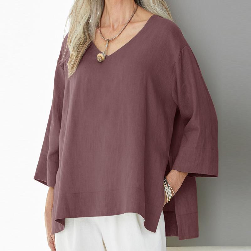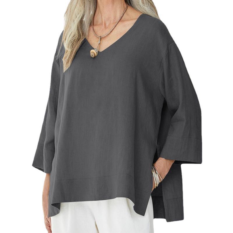 Большое количество в наличии трансграничных европейских и американских женских хлопковых и льняных рубашек с V-образным вырезом, топ, свободная футболка с семью рукавами и разрезом по бокам, большие размеры.