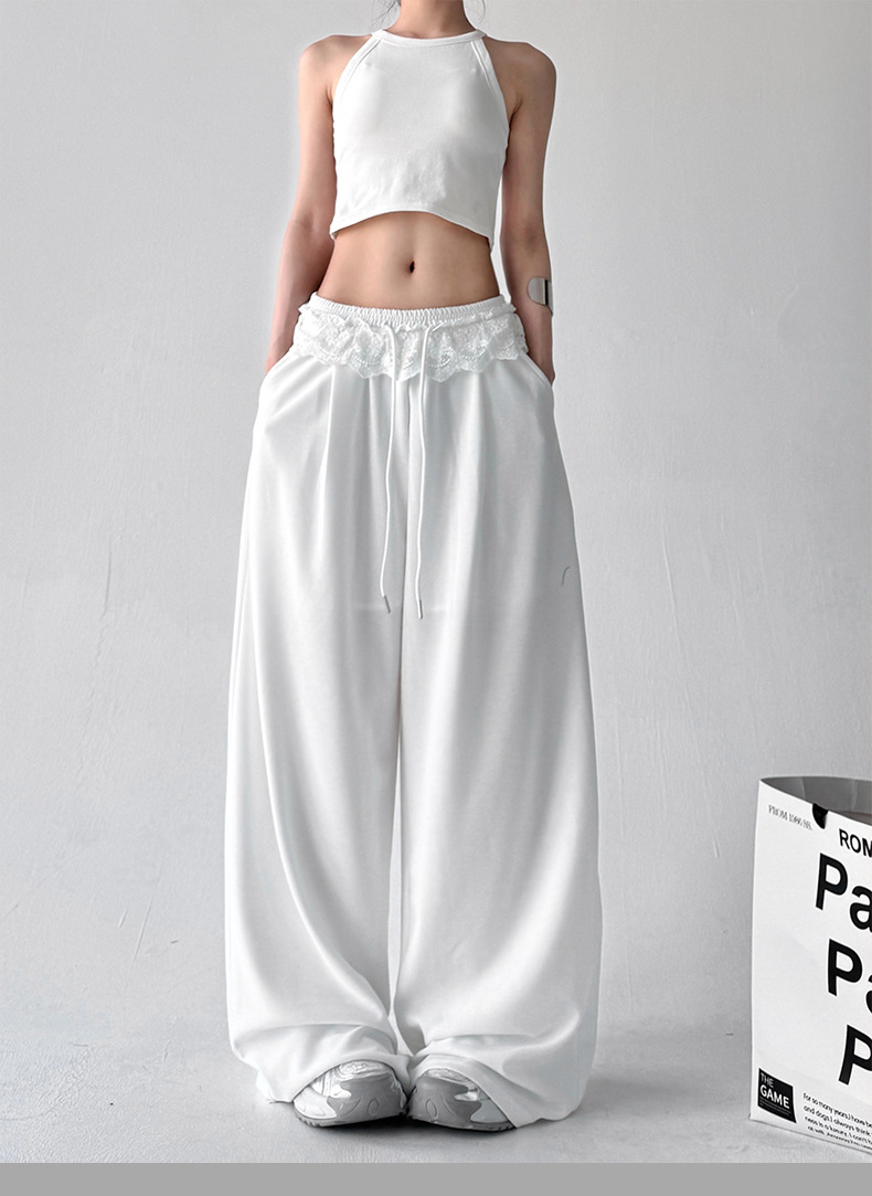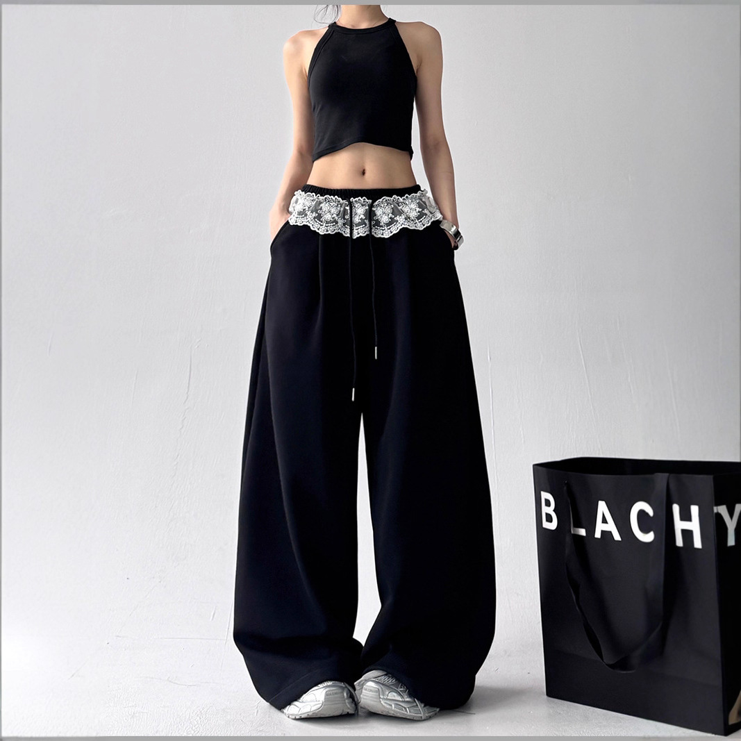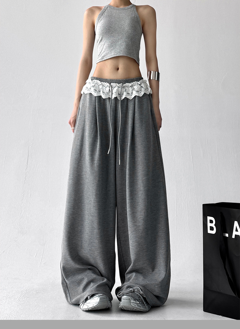 Главная страница > 阔腿裤女夏纯色宽松蕾丝抽绳休闲韩系垂感运动慵懒风甜妹纯欲长裤