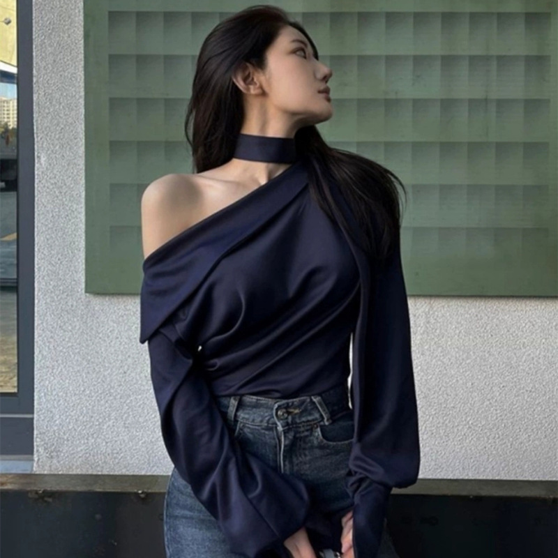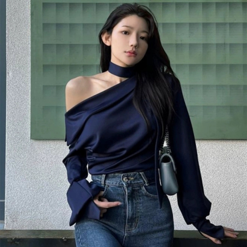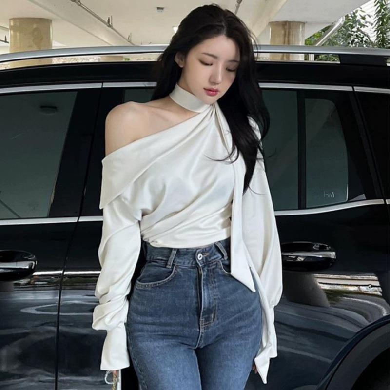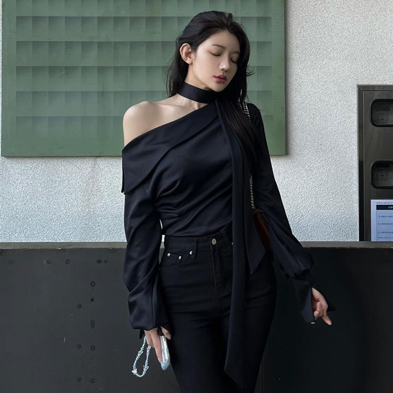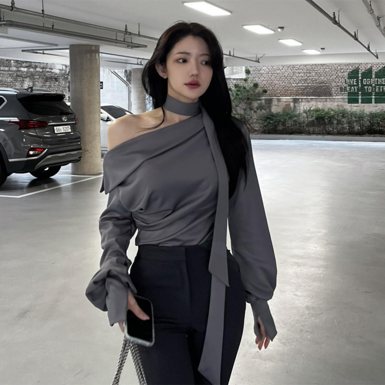 Главная страница > Стильная женская блузка с асимметричным вырезом на шее, открытыми плечами, длинными рукавами и лентами в корейском стиле, универсальная футболка для женщин.