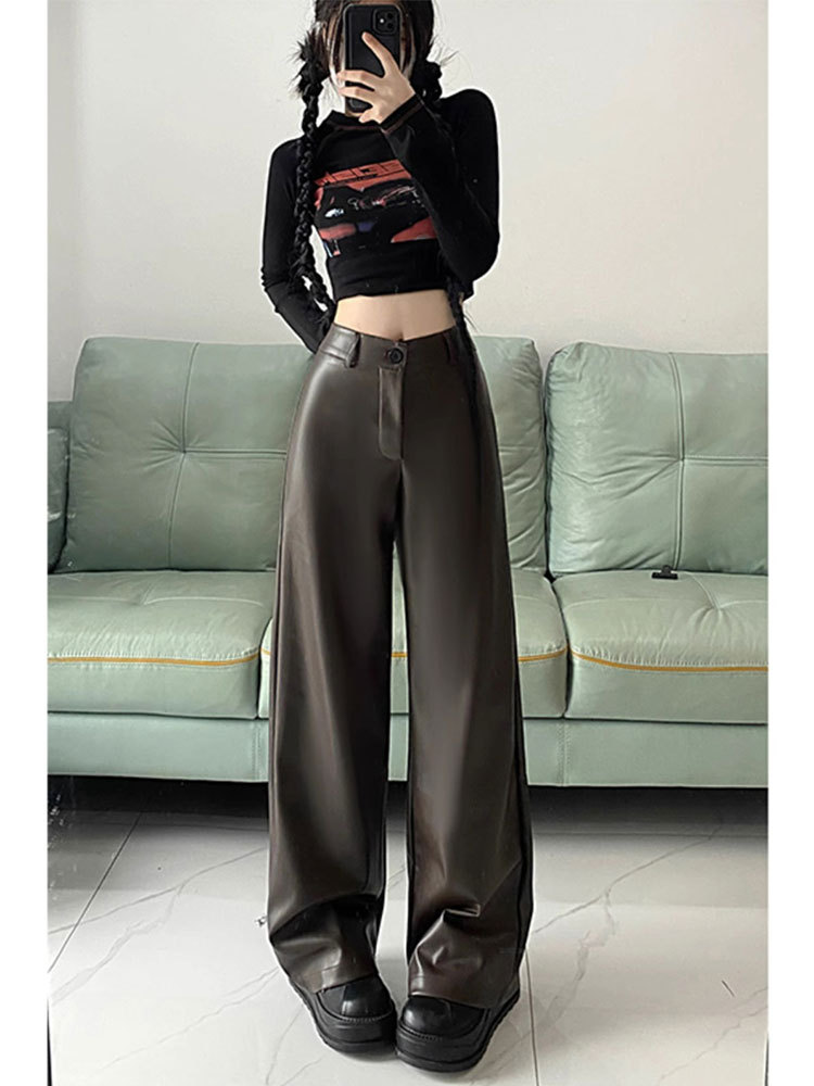 Черные кожаные брюки с высокой талией прямые женские осенние толстые сестры большого размера