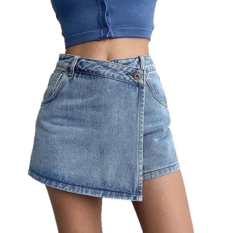 Джинсовые шорты А-силуэта с высокой талией для женщин, новый дизайн светлых оттенков с эффектом двухслойности, стильные и стройнящие брюки-юбка для модниц.