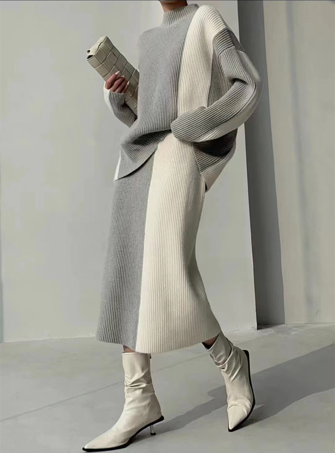 Главная страница > Женский костюм-свитер с юбкой контрастного цвета, осень-зима 2024, новый вязаный топ с высоким воротником и длинными рукавами, комплект из двух предметов