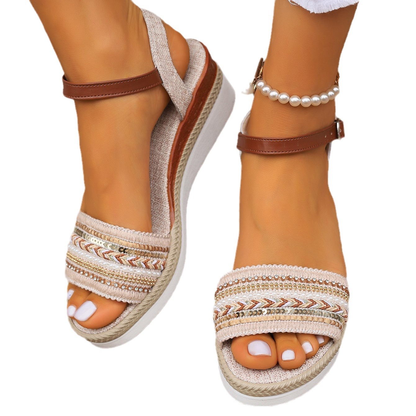 Главная страница > Соломенные стразы блеск на склоне на пятке с толстой подошвой сандалии 2024 летом новый простой и удобный мода на каблуках с пряжкой
