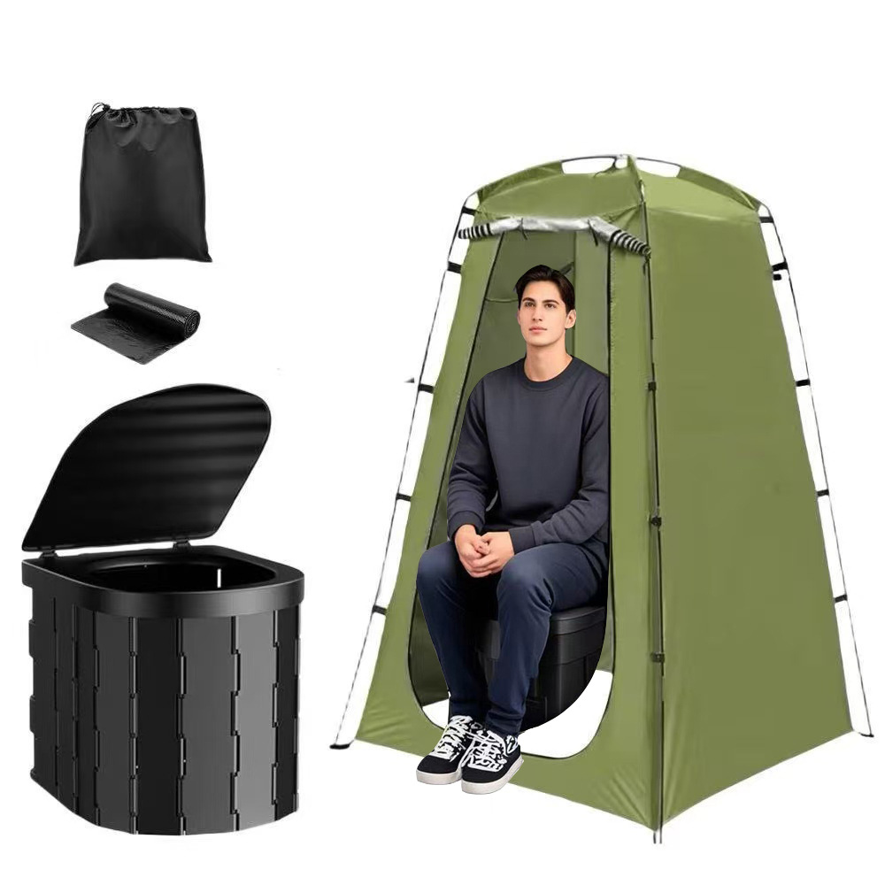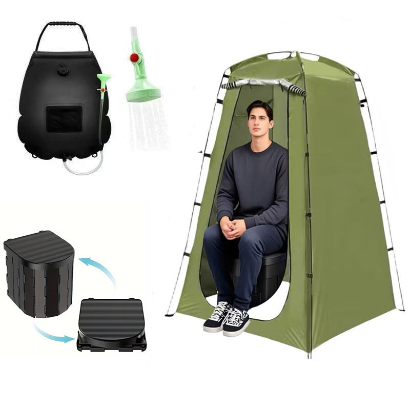 Военная зеленая палатка + черная сумка для душа + черный туалет (12 отвердителей + 12 мешков для мусора))