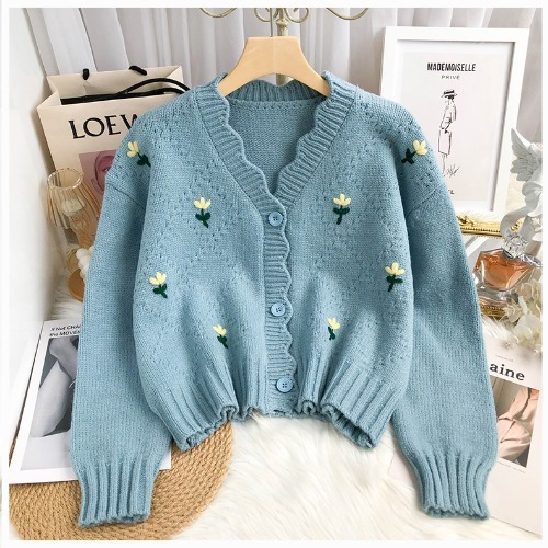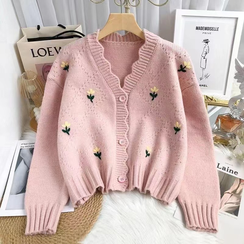 Главная страница > 2023 осень-зима Новый однобортный вязаный кардиган с V-образным вырезом и вышивкой в японском стиле, свежий и милый свободный свитер пальто для женщин