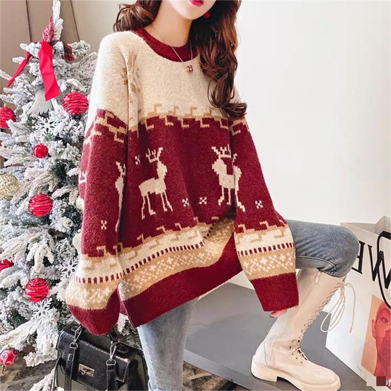 Осень-зима 2022, новый красный Рождественский пуловер с оленем, свитер, женский свободный универсальный топ в ленивом стиле в Корейском стиле для верхней одежды