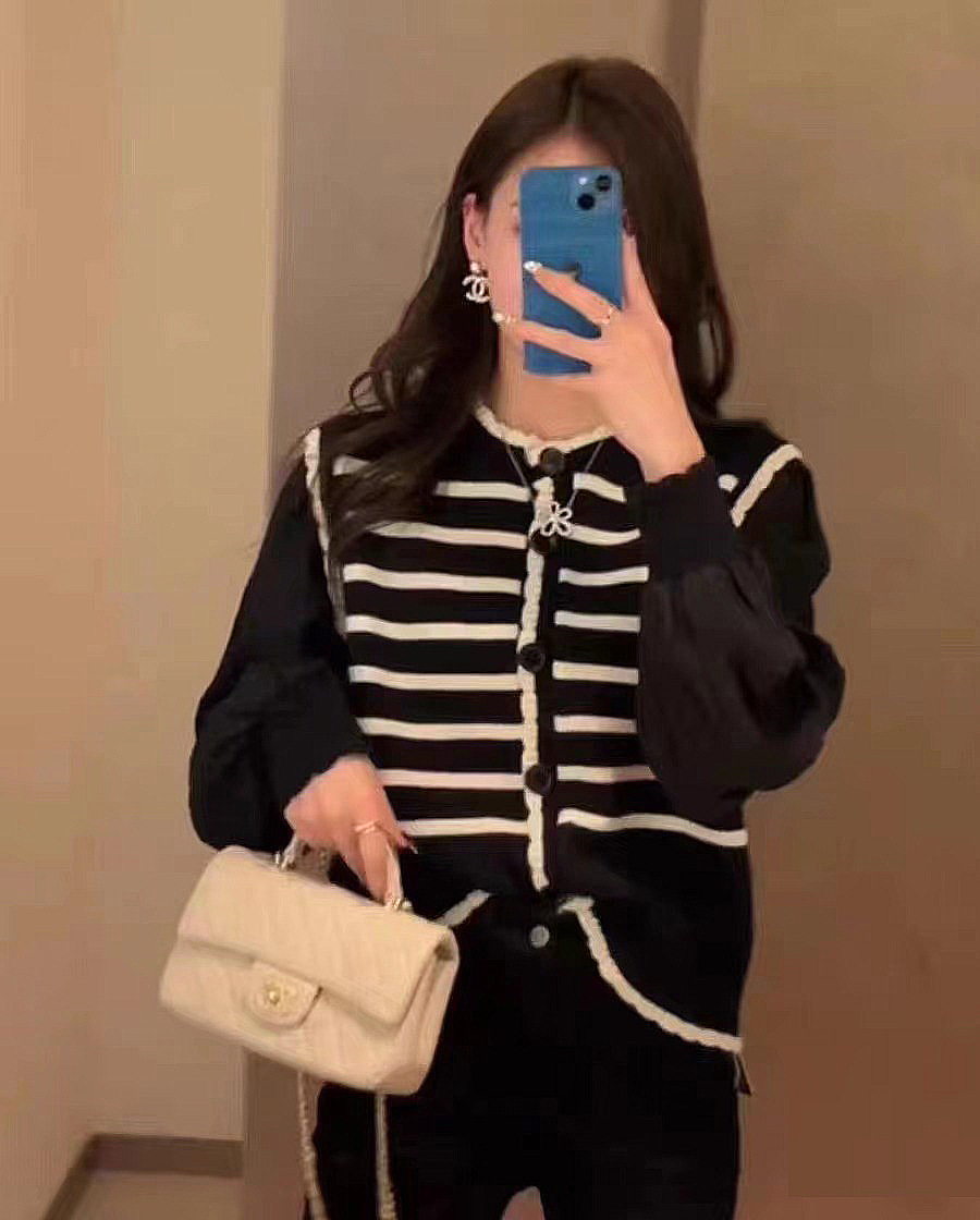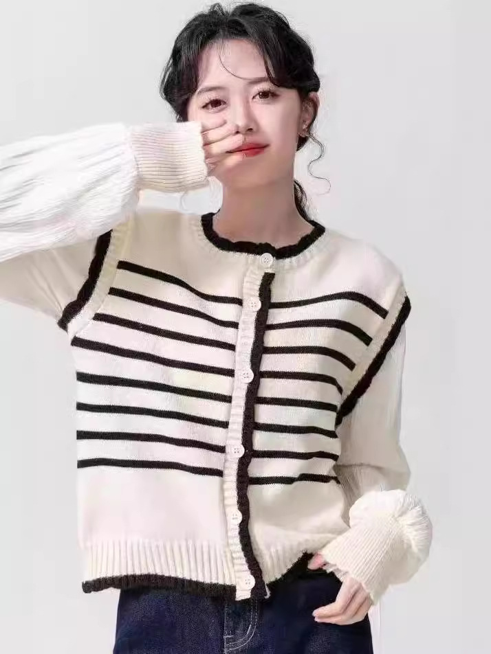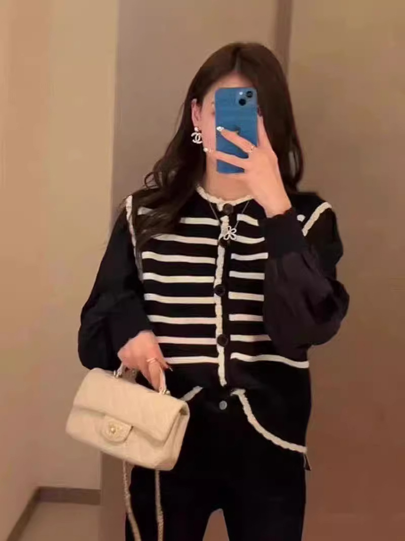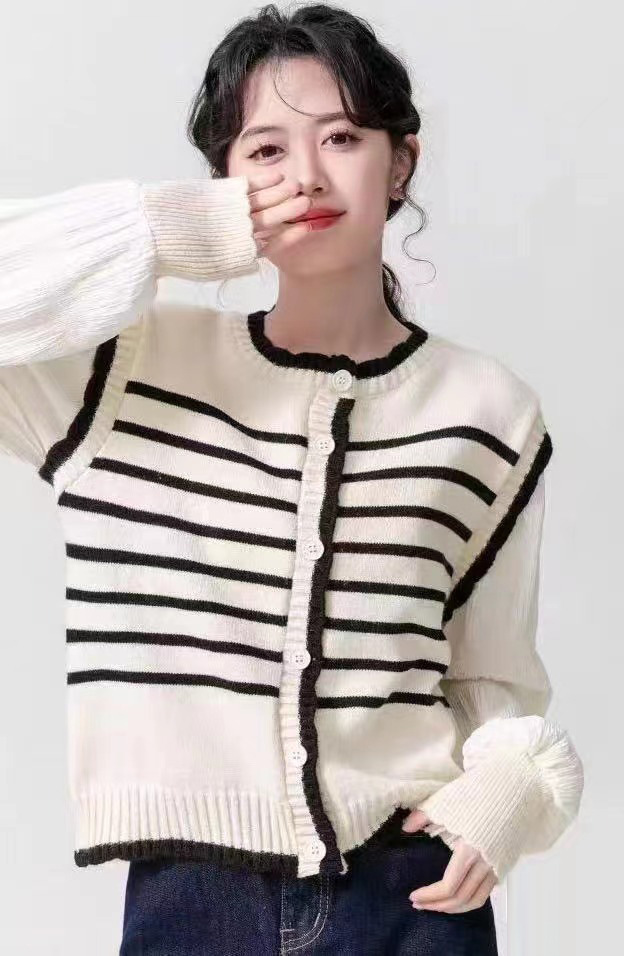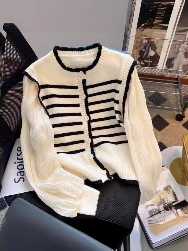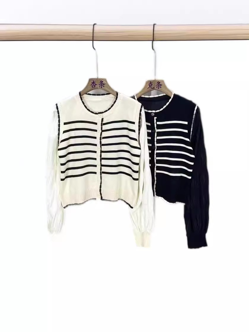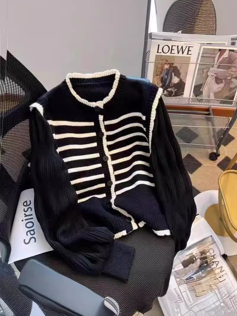 Главная страница > 2024 Ранняя весна новый корейский стиль с круглым вырезом в полоску свитер свитер женский сшивание складки с пузырьками рукава кардиган топ женский