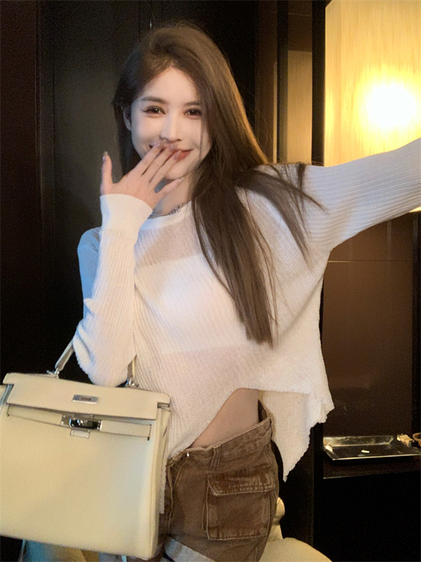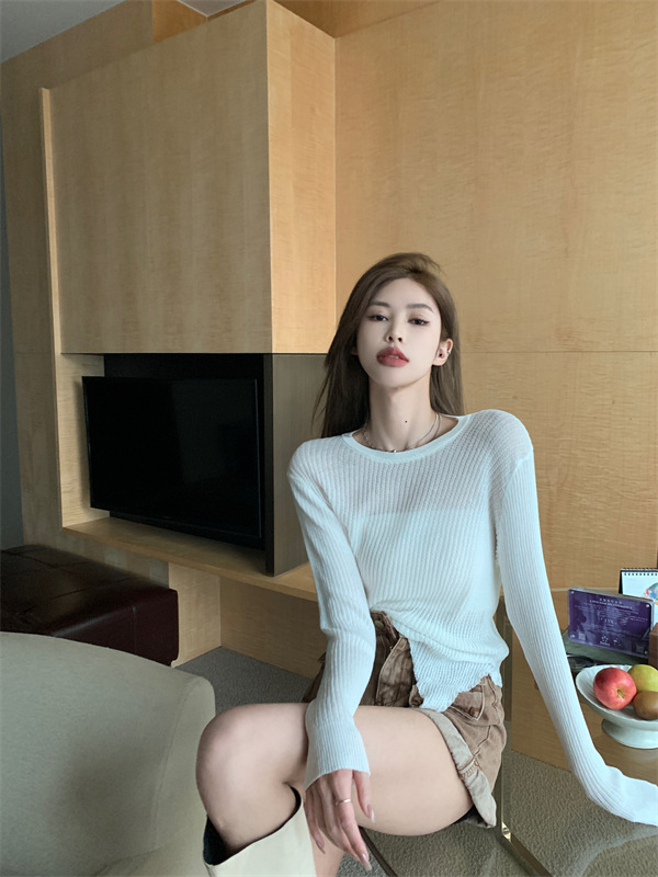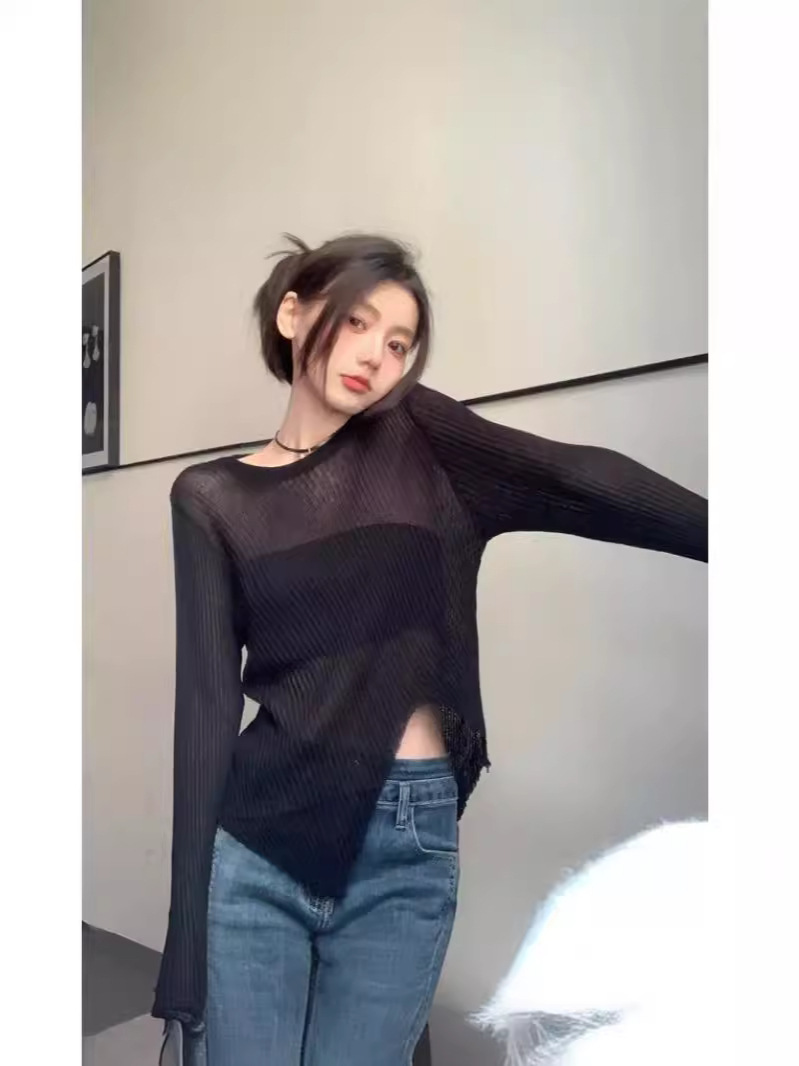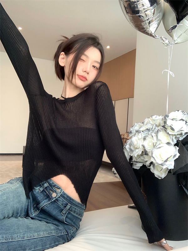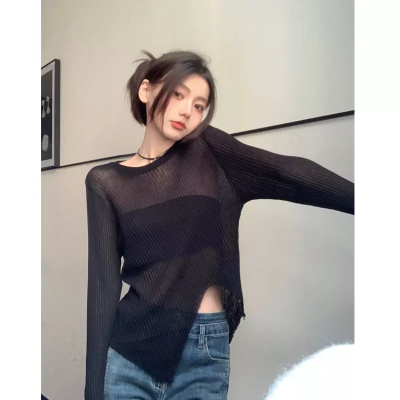 Главная страница > Необычный свитер с длинными рукавами для женщин, летний тонкий, слегка прозрачный дизайн, свободный утягивающий пуловер, солнцезащитная блузка, топ