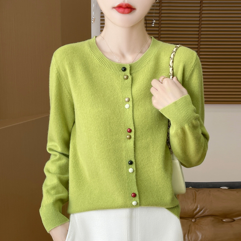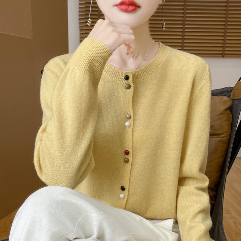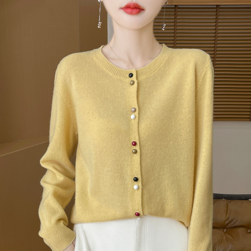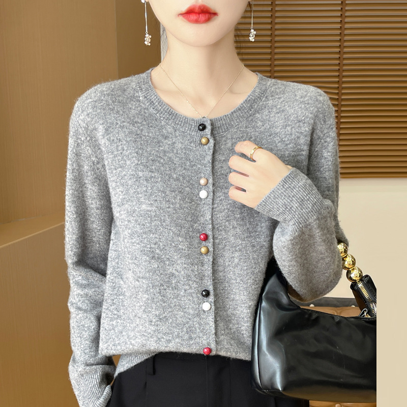 Оптовая продажа 2024 корейских иностранных пуговиц мягкий клейкий короткий свитер с круглым вырезом куртка женская весна и осень носить дикие оптом