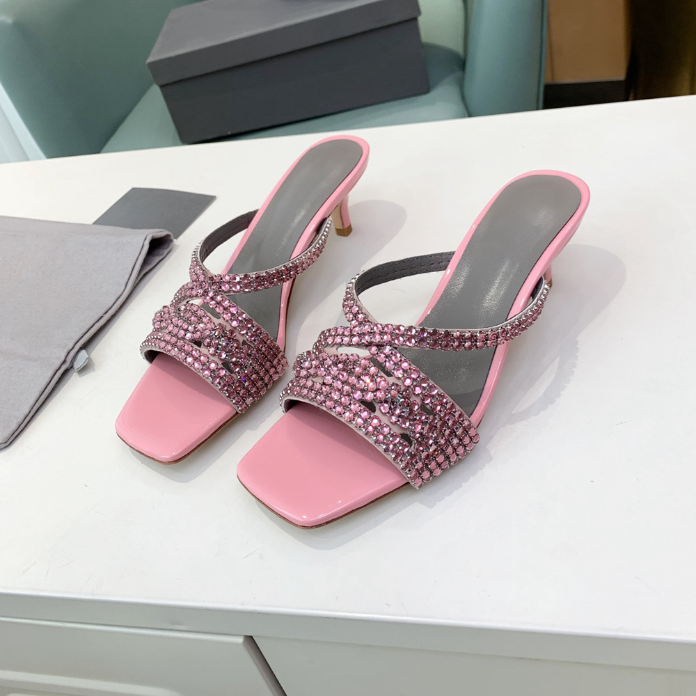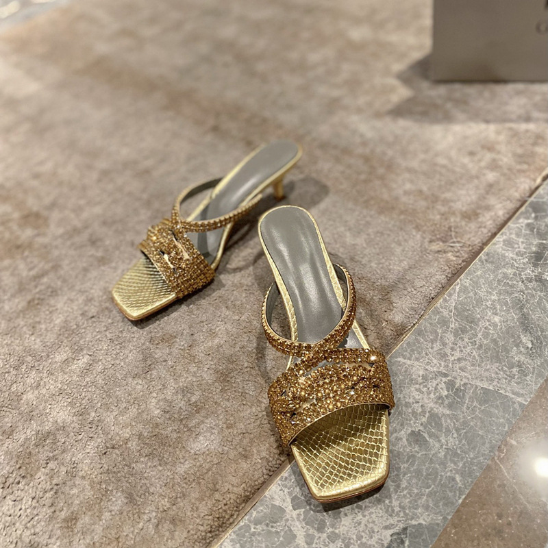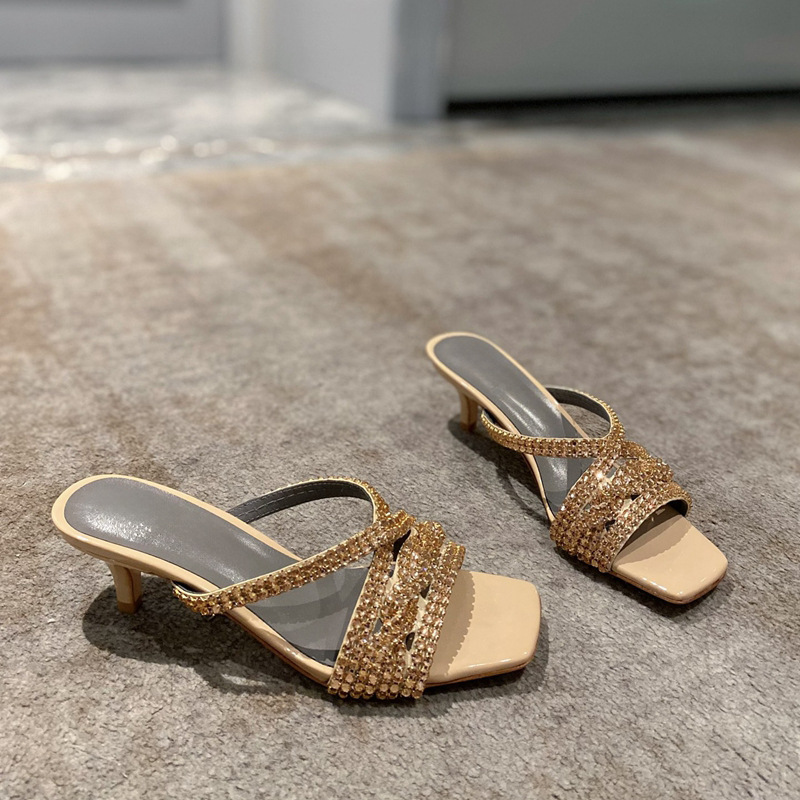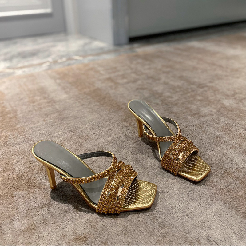 Женские босоножки-шлепанцы 2025 года, новые модели, на высоком каблуке-шпильке, открытый носок, золотистые стразы, лакированная кожа, на одной ремешке.