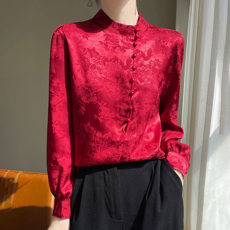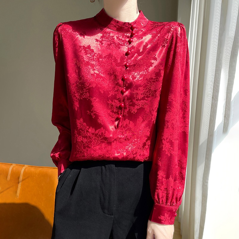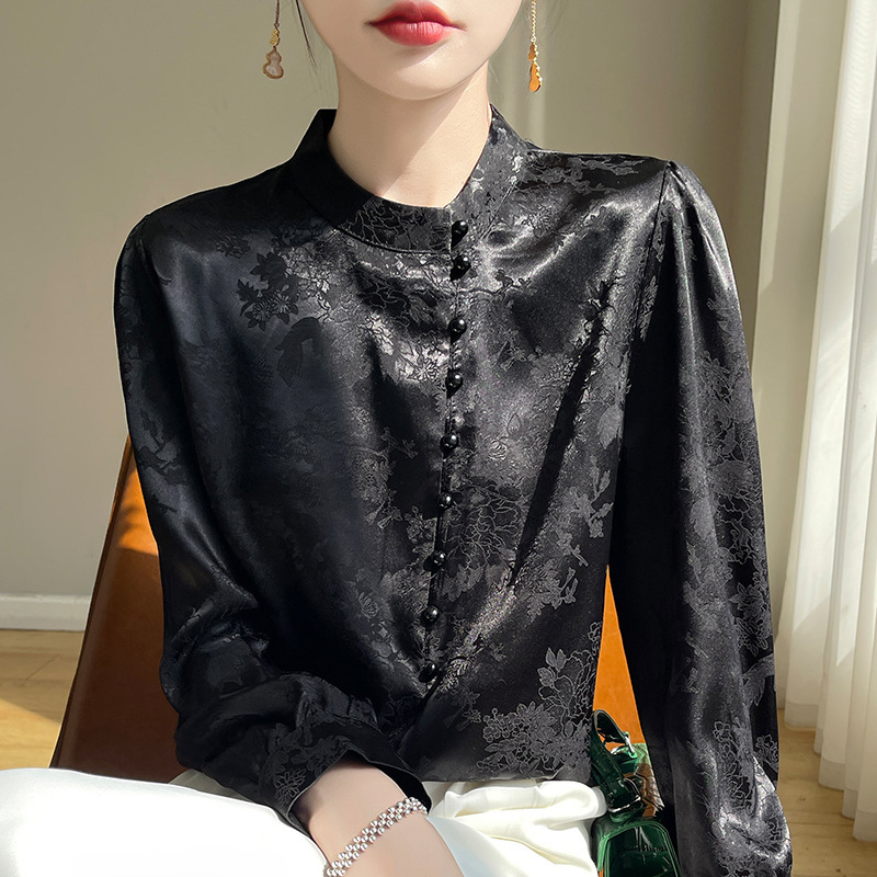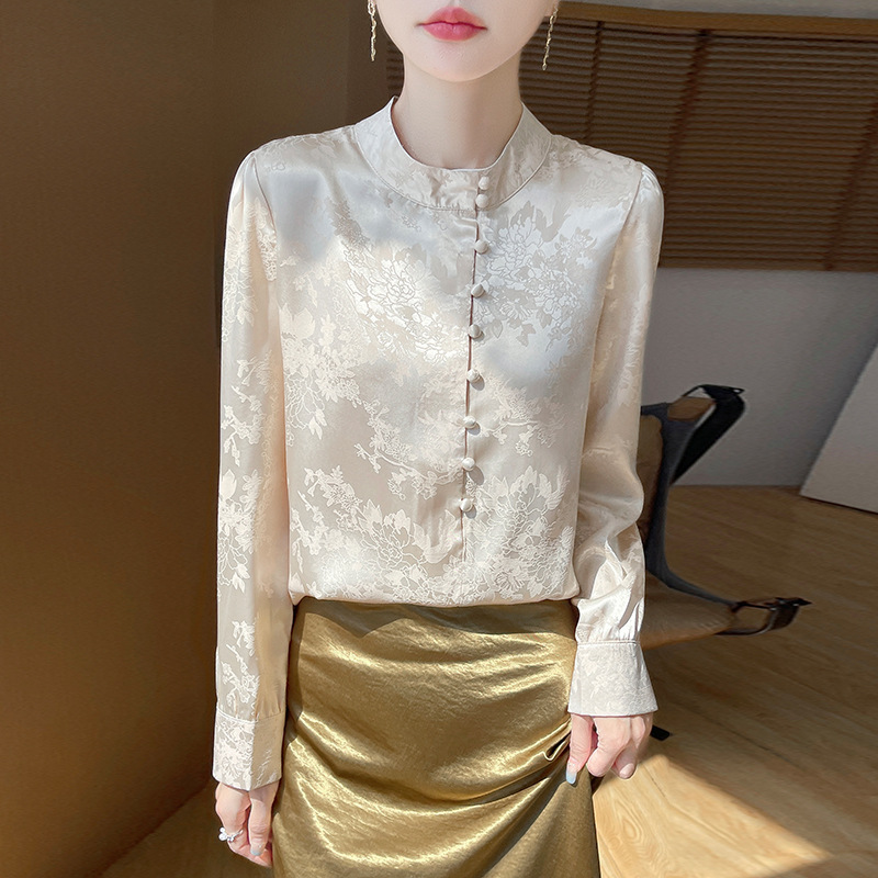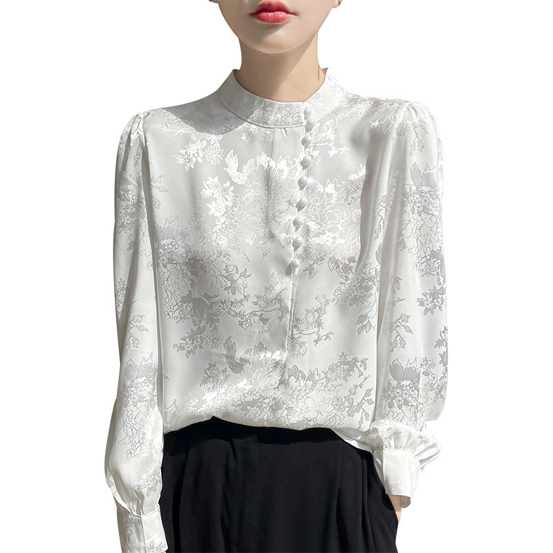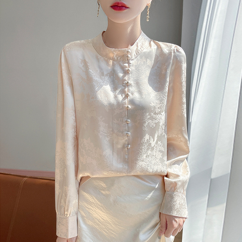 Главная страница > Новая атласная нижняя рубашка с длинными рукавами для женщин, новый весенний темпераментный белый топ в китайском стиле с воротником-стойкой