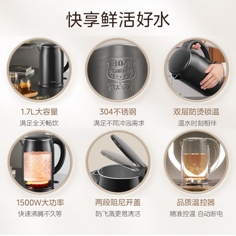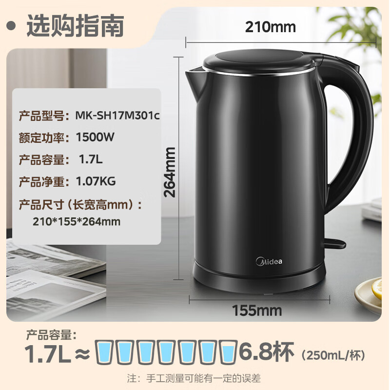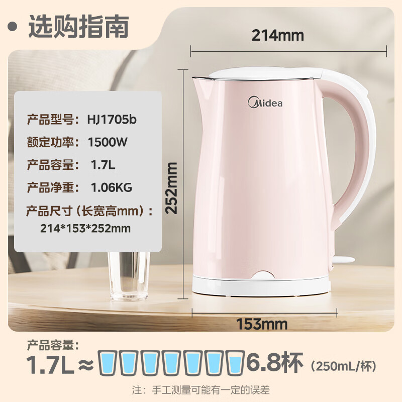 Главная страница > Midea Электрический чайник 1,7 литра большой емкости бытовой чайник двухслойный анти-ожогов автоматическое отключение питания SH17M30