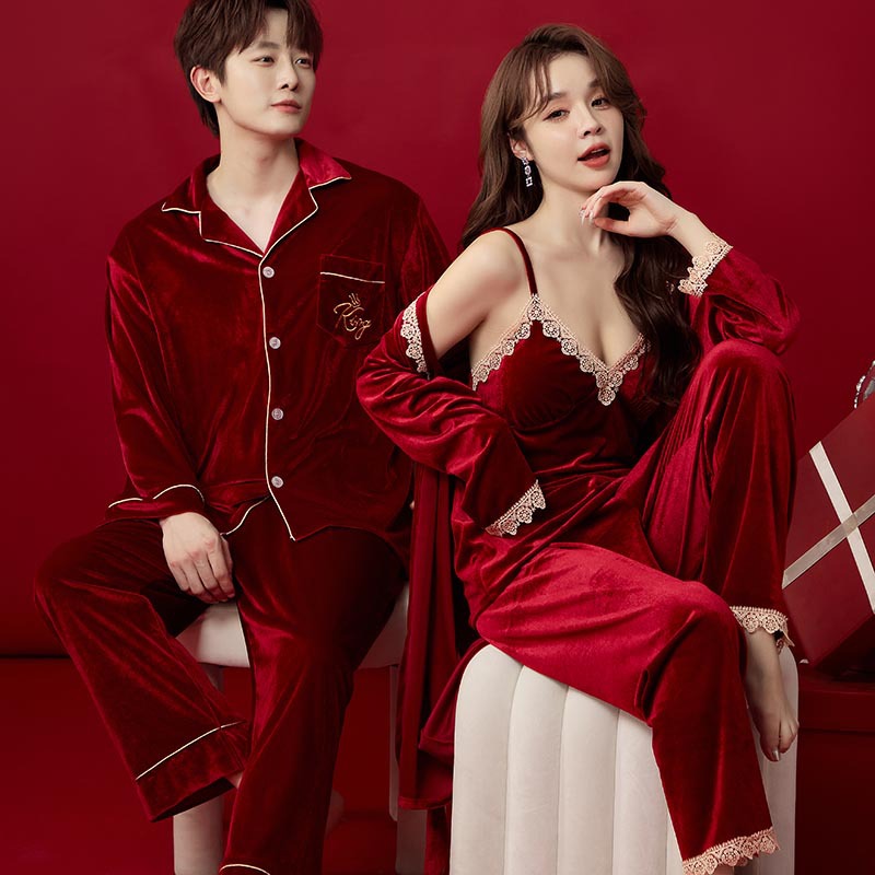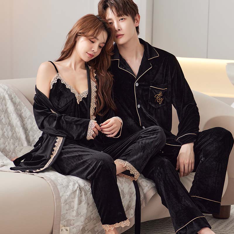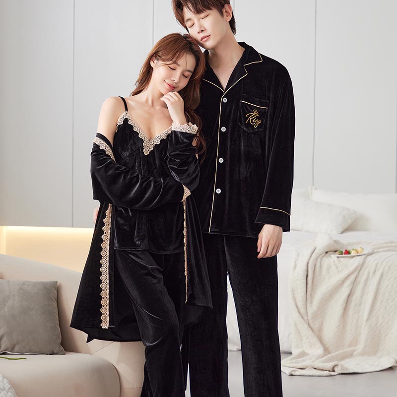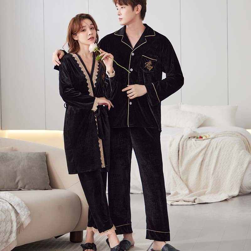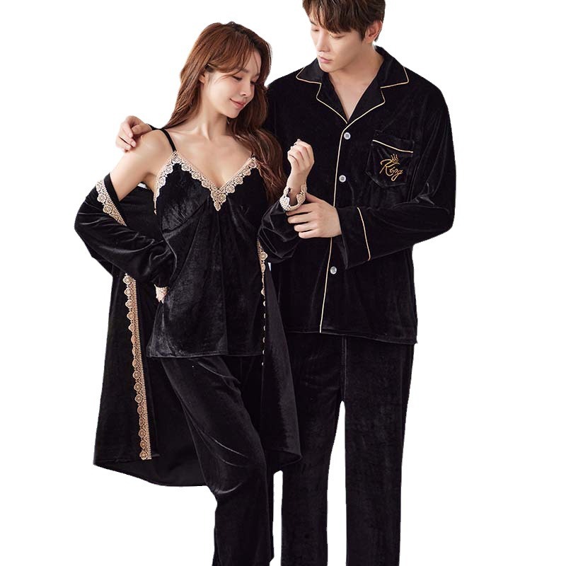 Главная страница > Золотая бархатная пара пижамы весна-осень кардиган мужской с длинным рукавом Свободная Домашняя одежда больших размеров мужской и женский комплект из трех предметов