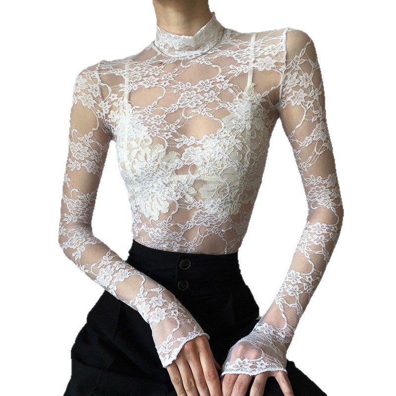 Главная страница > 2023 Европейские и американские трансграничные однотонные элегантные солнцезащитные тонкие кружевные прозрачные футболки с длинными рукавами и половиной высокого воротника для женщин