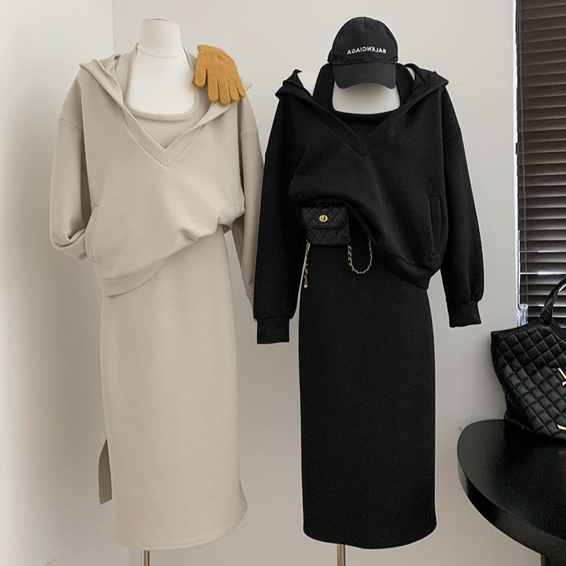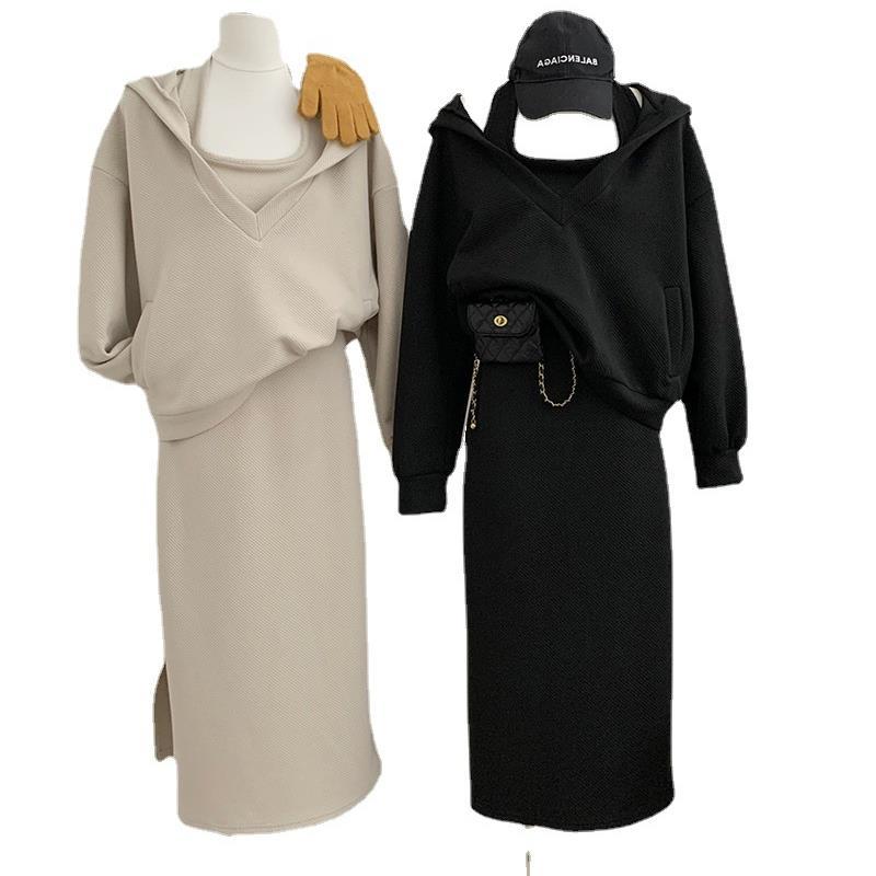 Главная страница > Костюм-двойка для женщин: осенне-зимнее платье-халат свободного кроя с капюшоном и топ-халтер, повседневный модный комплект из двух предметов