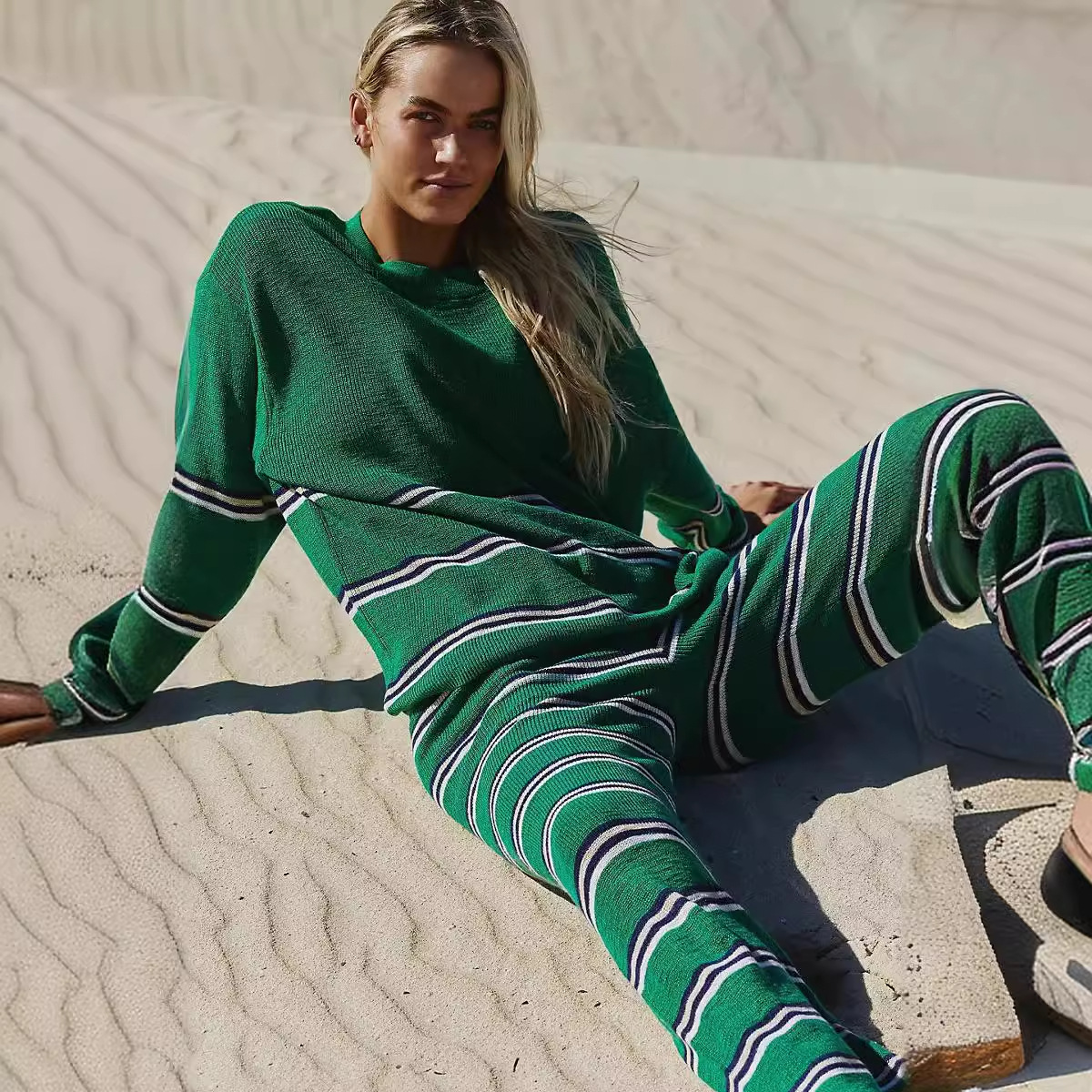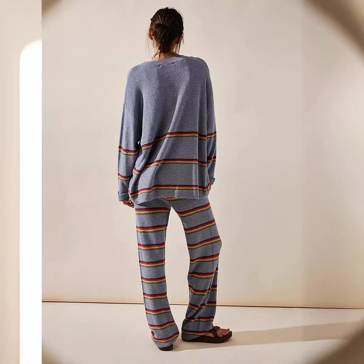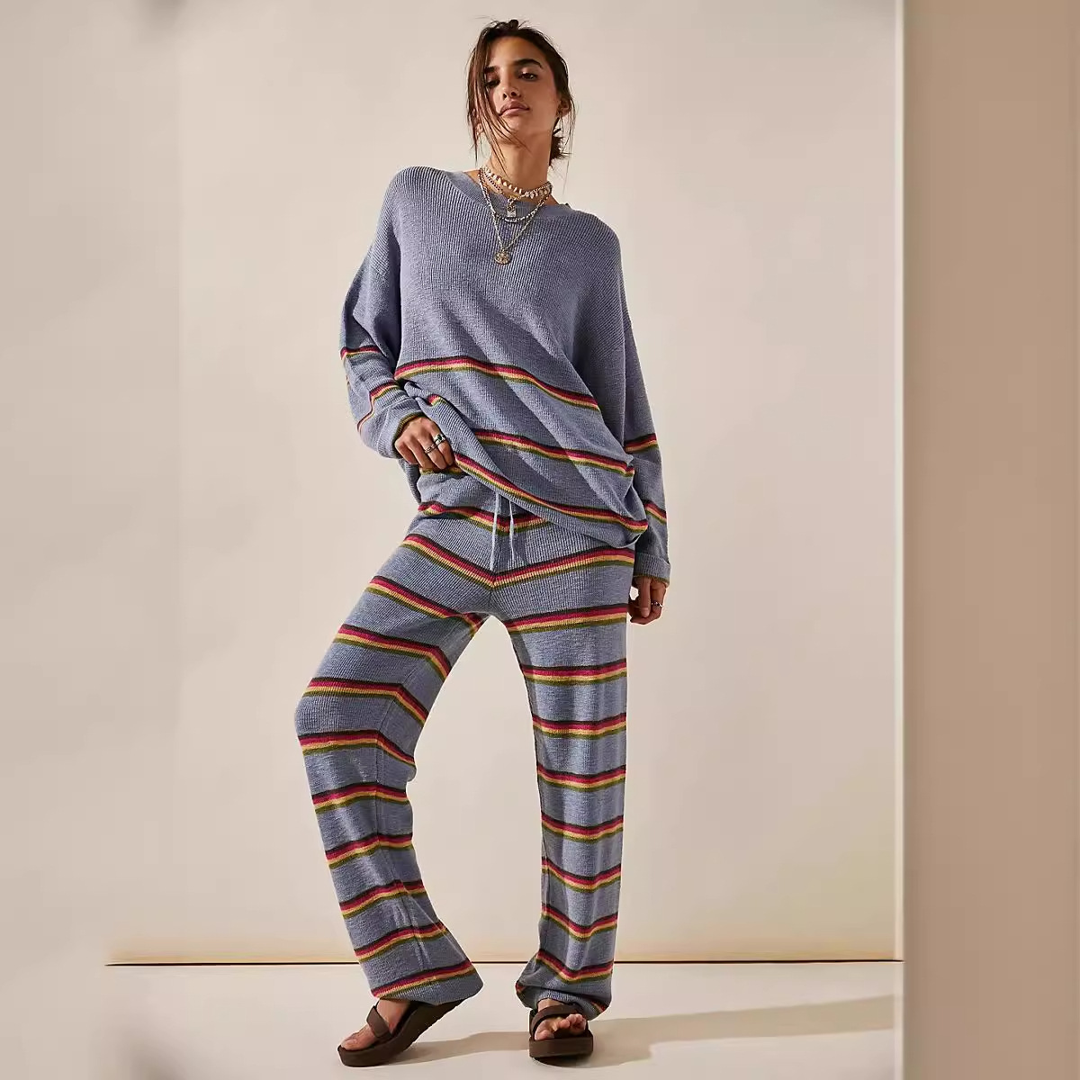 Главная страница > Европейская и американская женская одежда осень и зима новый темперамент с круглым вырезом с длинным рукавом в полоску свитер из двух частей свободный повседневный брюки костюм женский
