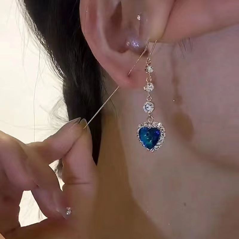 Популярные синие кристаллы с принтом от сердца к сердцу, прекрасные линии для ушей, легкие Роскошные нишевые высококачественные длинные серьги для похудения, элегантные универсальные