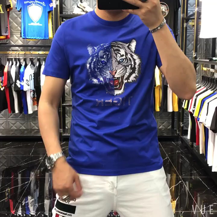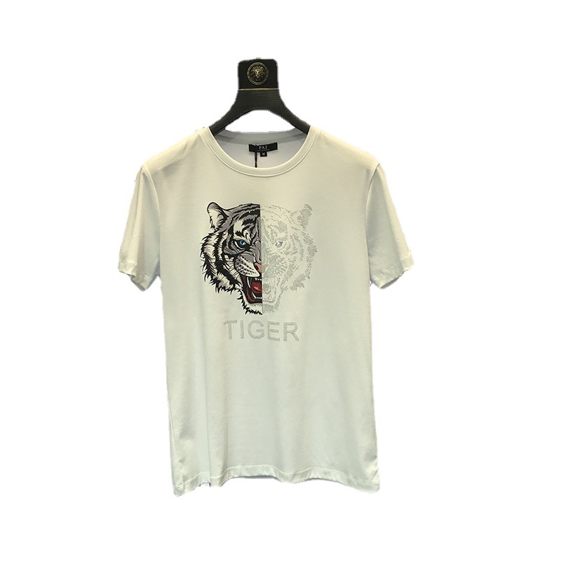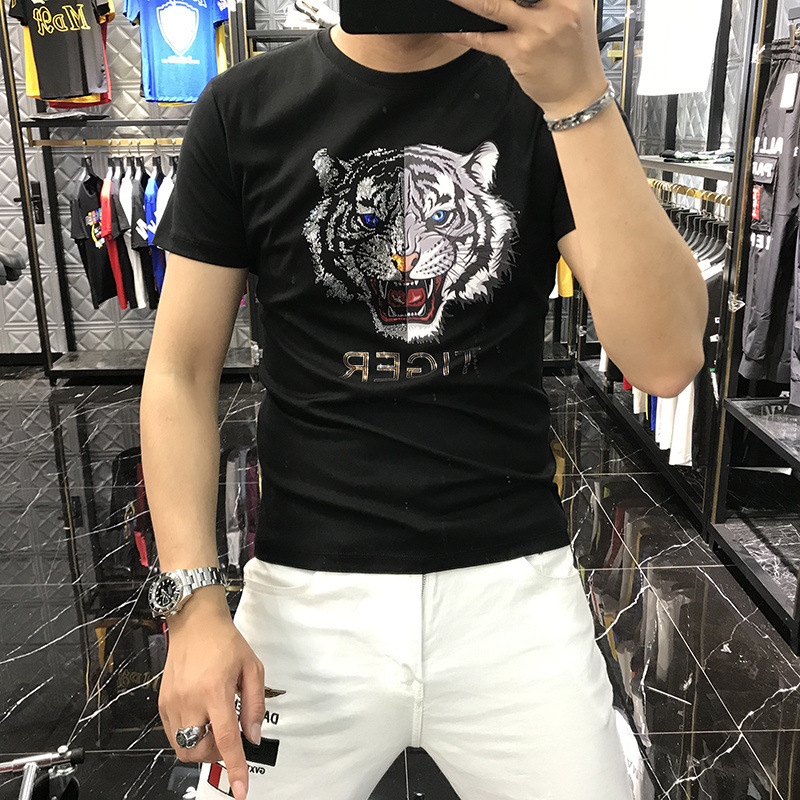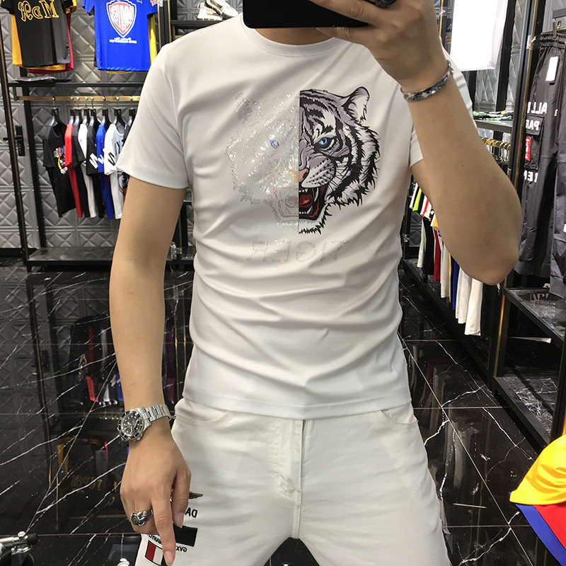 Главная страница > Европейская летняя новая мужская футболка из мерсеризованного хлопка с короткими рукавами, модная футболка в корейском стиле с тяжелыми стразами и принтом головы тигра