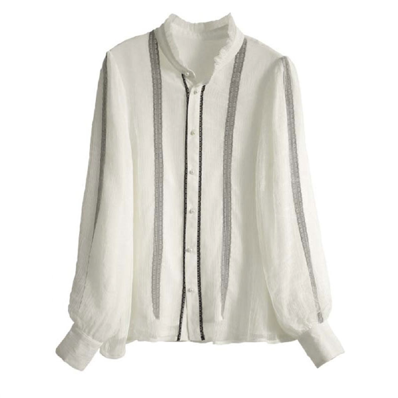 Кружевная отделка с рюшами в французском стиле, небольшой воротник-стойка, двухслойный дизайн, однобортная женская рубашка с длинными рукавами, новая модель топа на раннюю осень 2025 года.