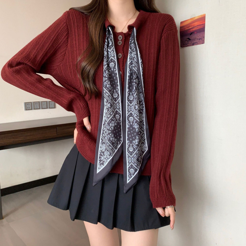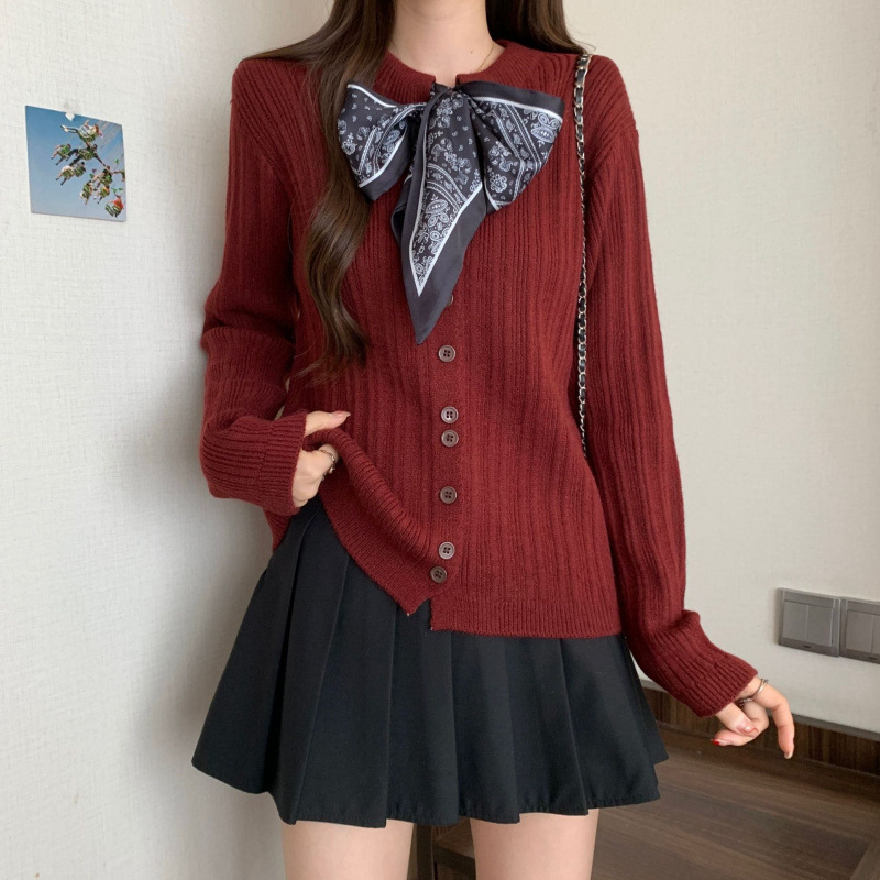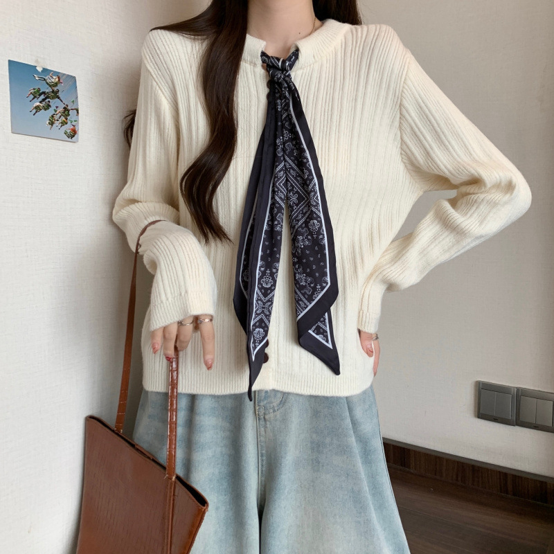 Шелковый шарф на шнуровке в стиле ретро, трикотаж с длинными рукавами для женщин, осенне-зимний новый вязаный кардиган с круглым вырезом и длинными рукавами