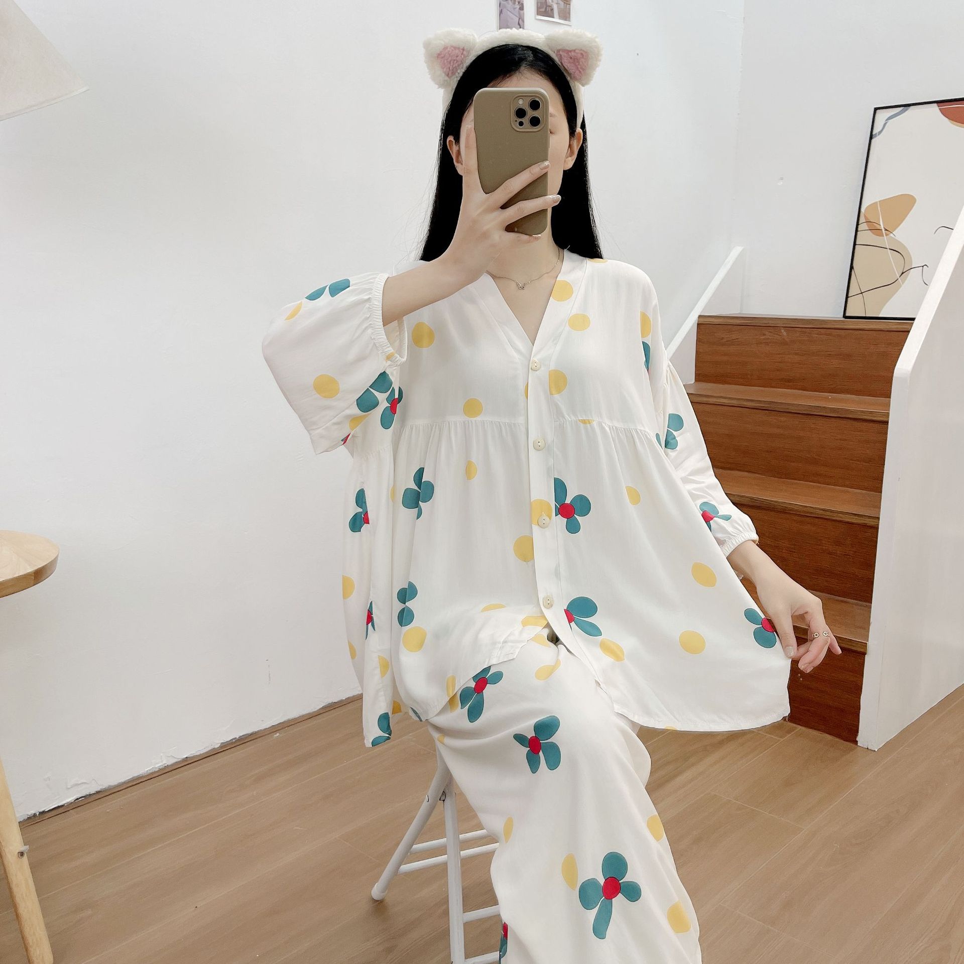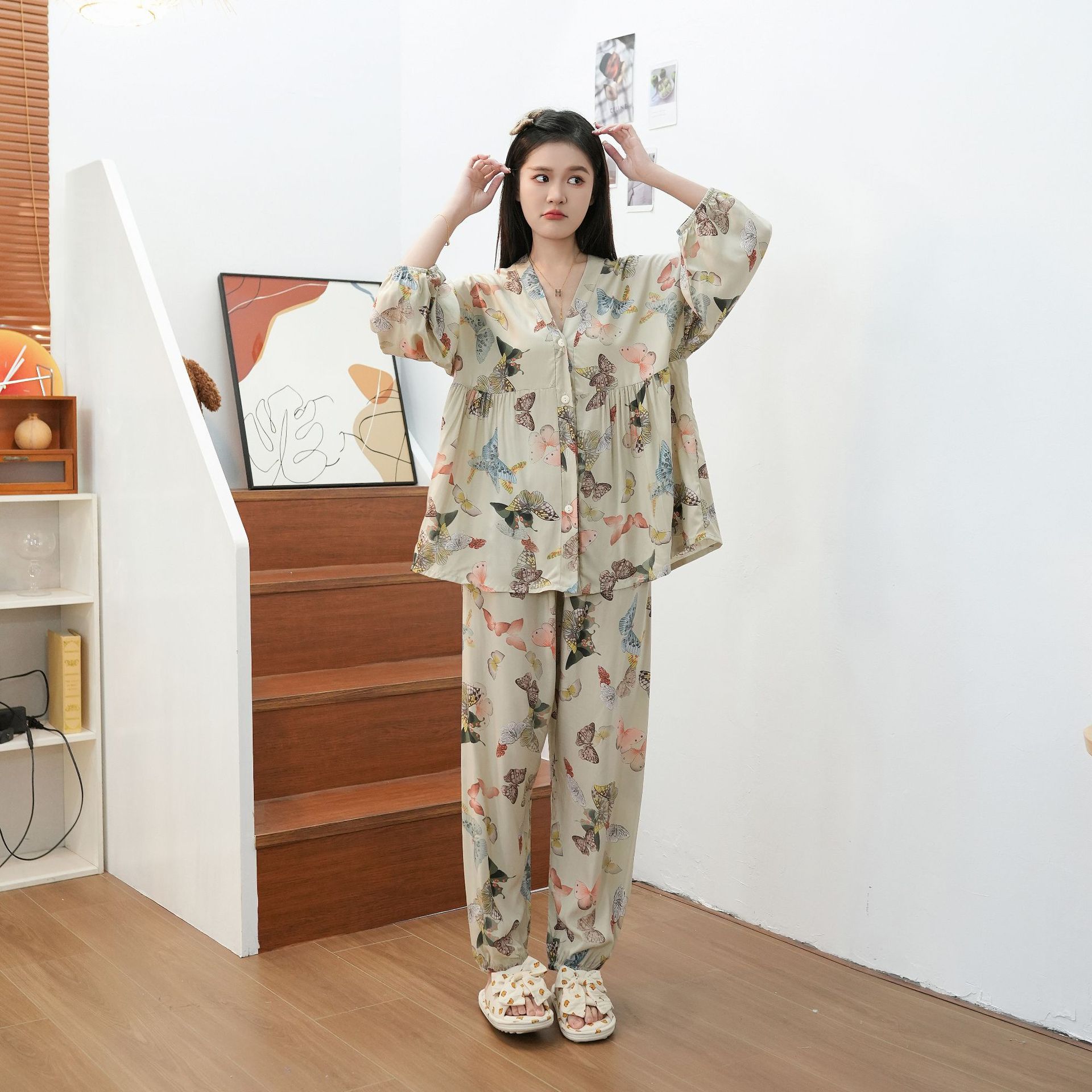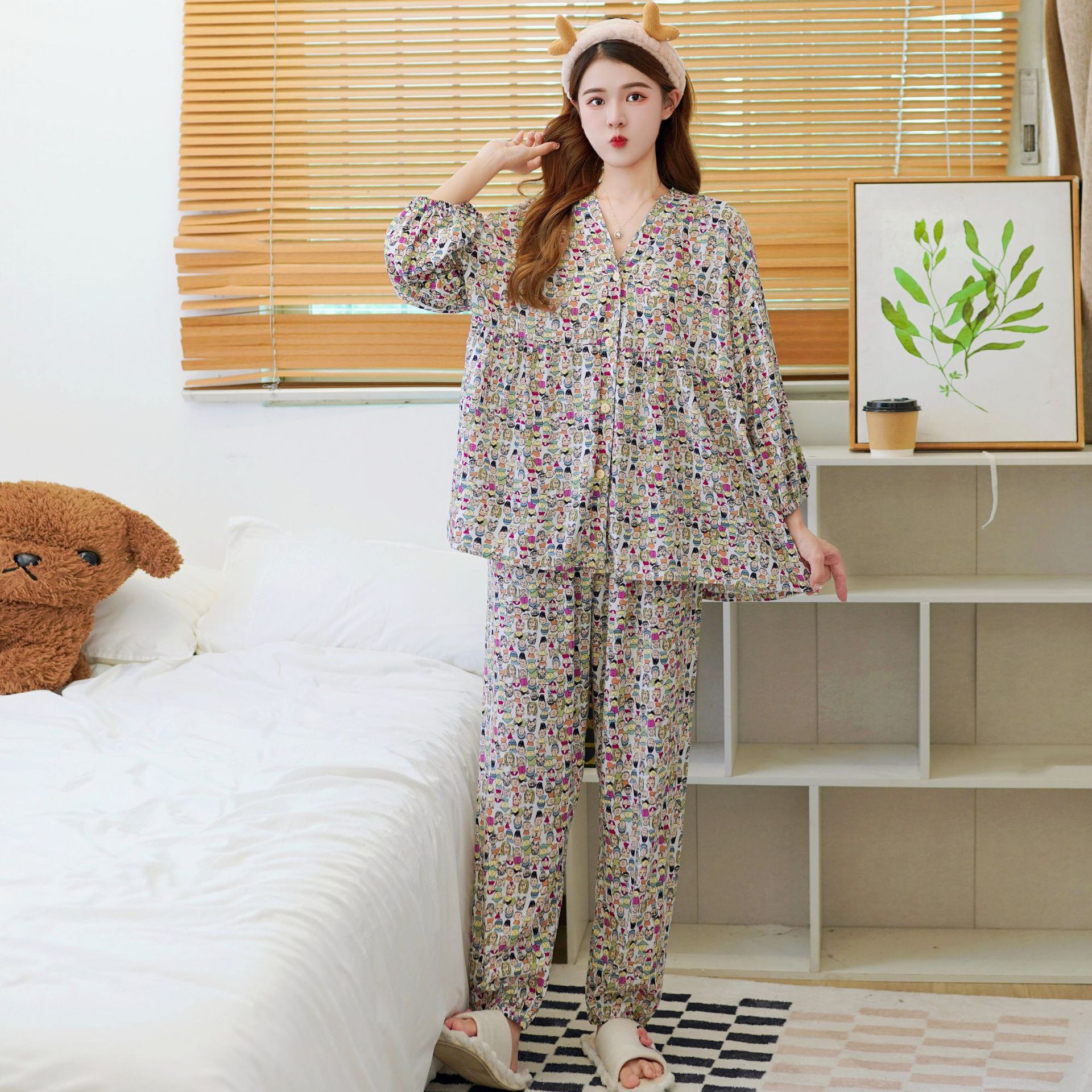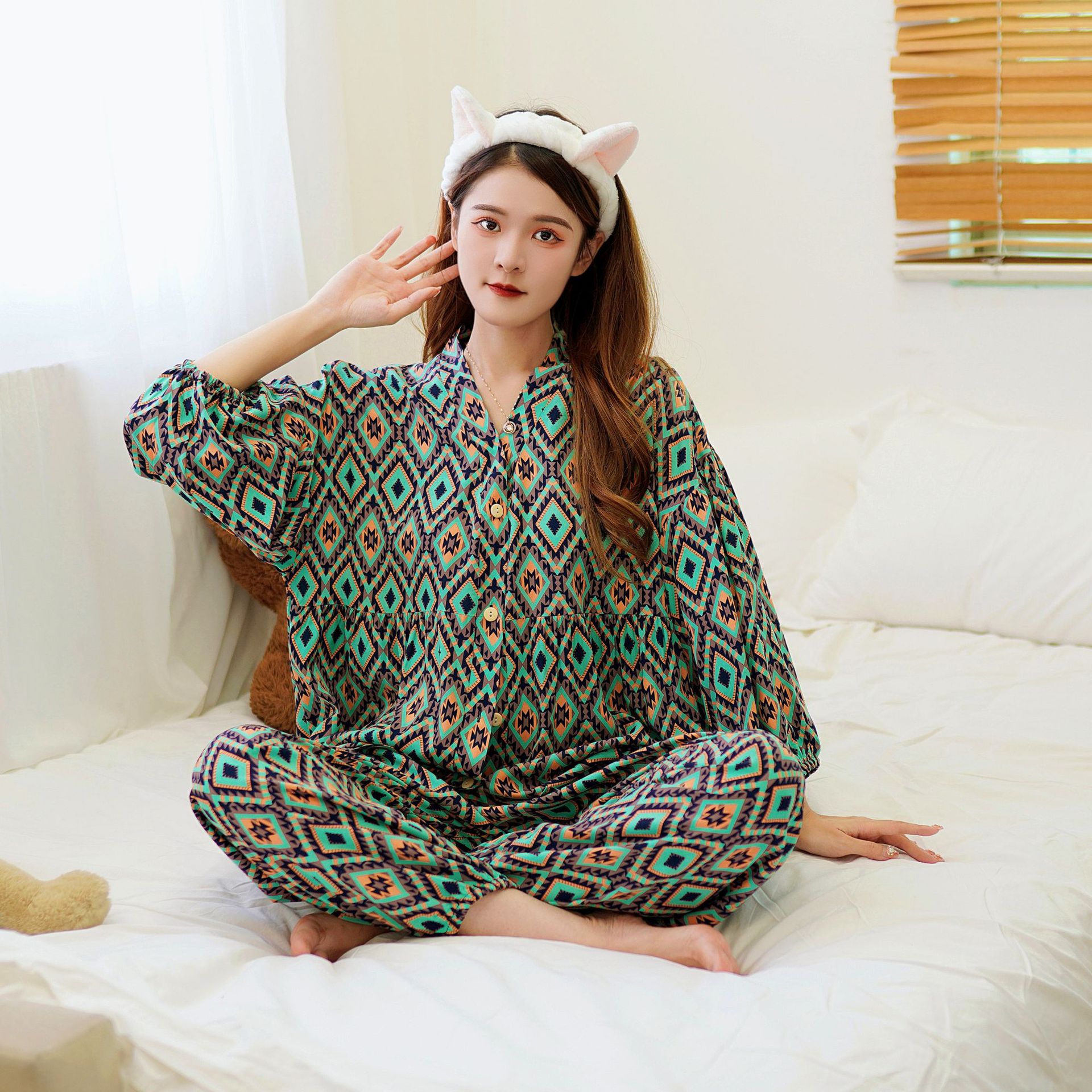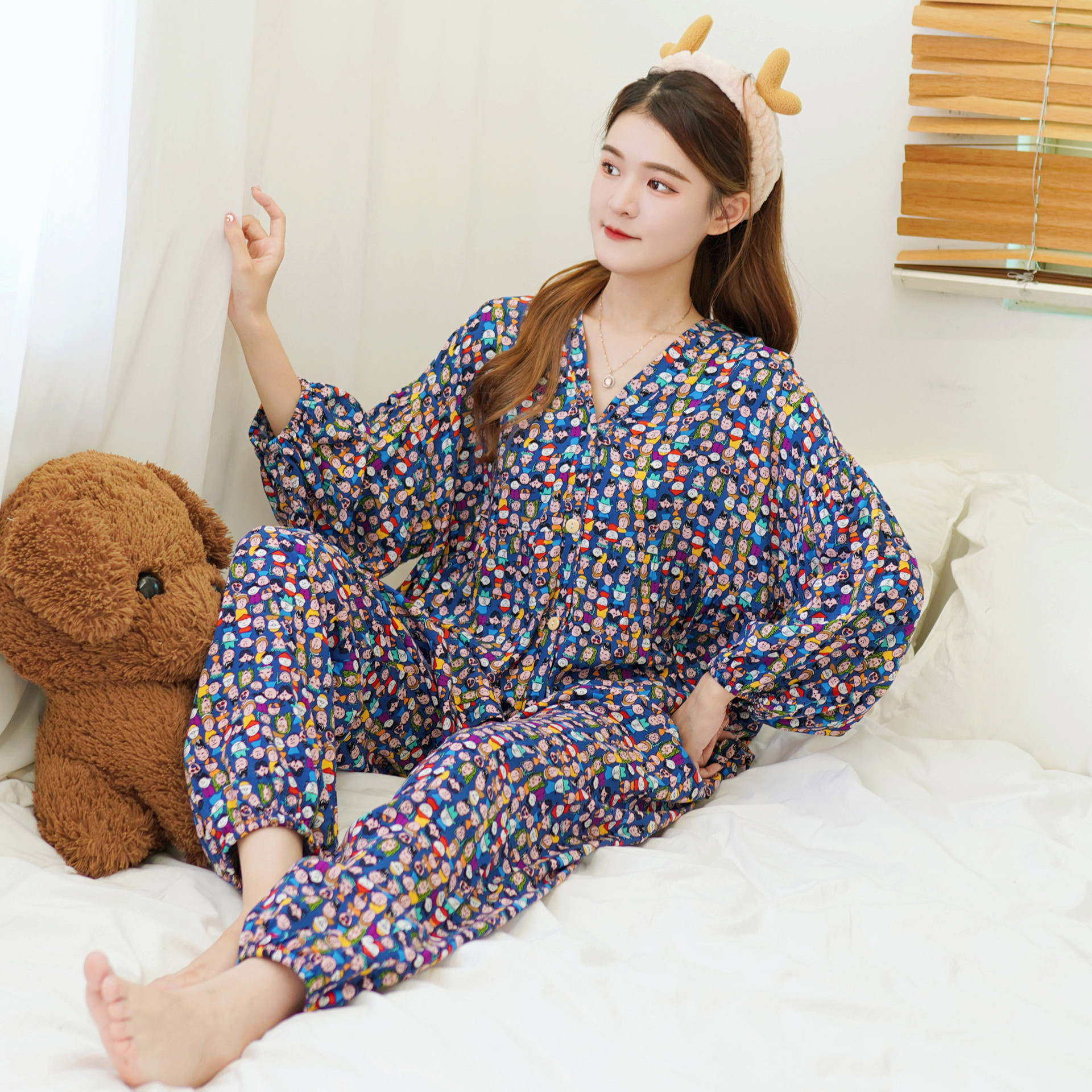 Главная страница > Осенняя новая хлопковая Шелковая пижама, Женский хлопковый Шелковый костюм с укороченным рукавом на пуговицах, корейская мода, большие размеры, домашняя одежда, шаровары