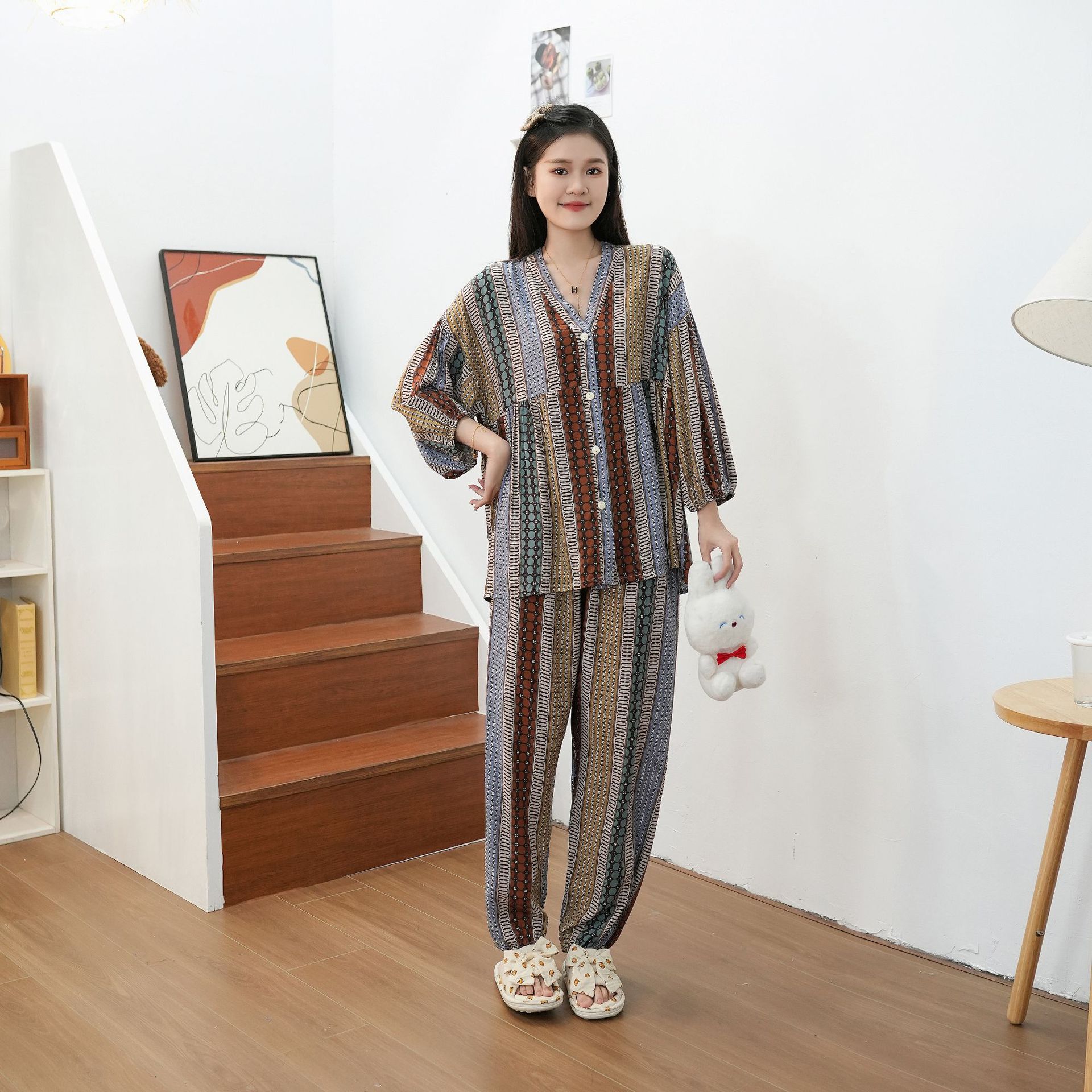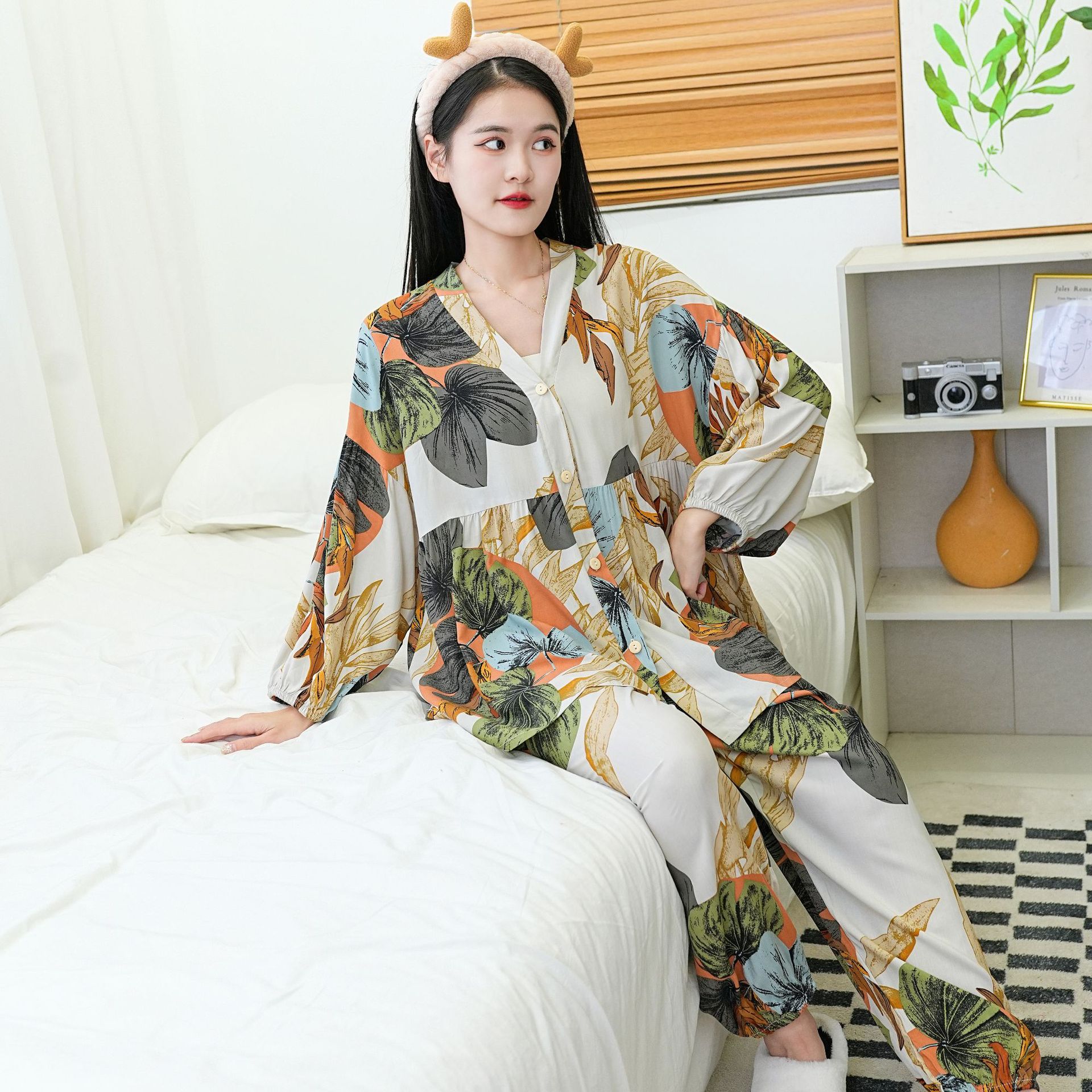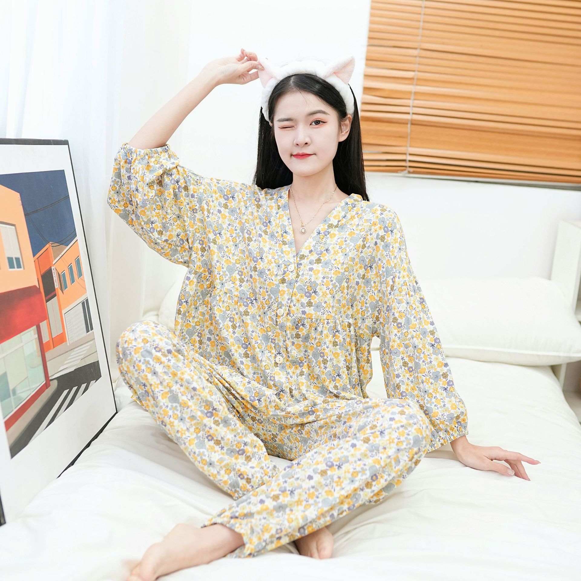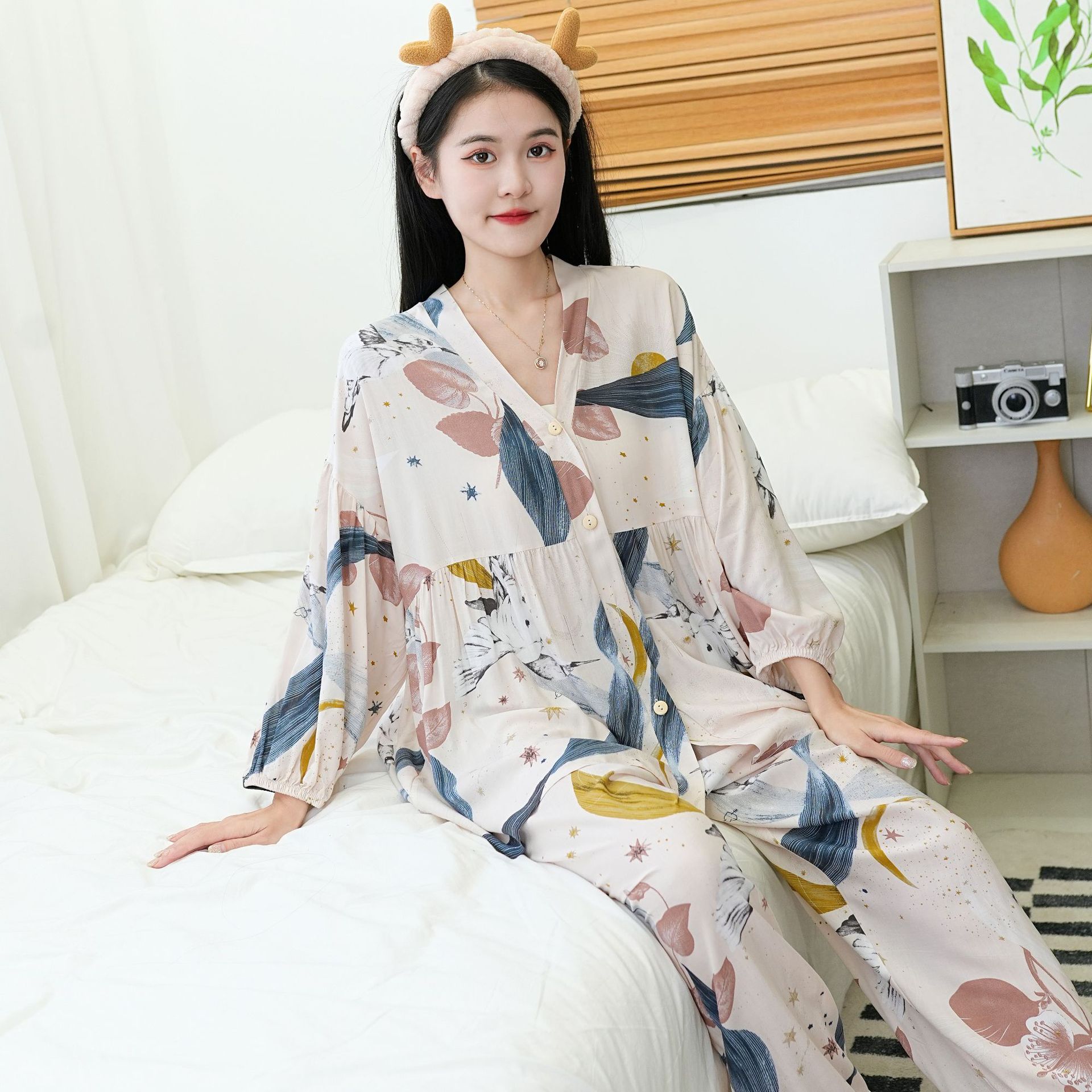 Главная страница > Осенняя новая хлопковая Шелковая пижама, Женский хлопковый Шелковый костюм с укороченным рукавом на пуговицах, корейская мода, большие размеры, домашняя одежда, шаровары