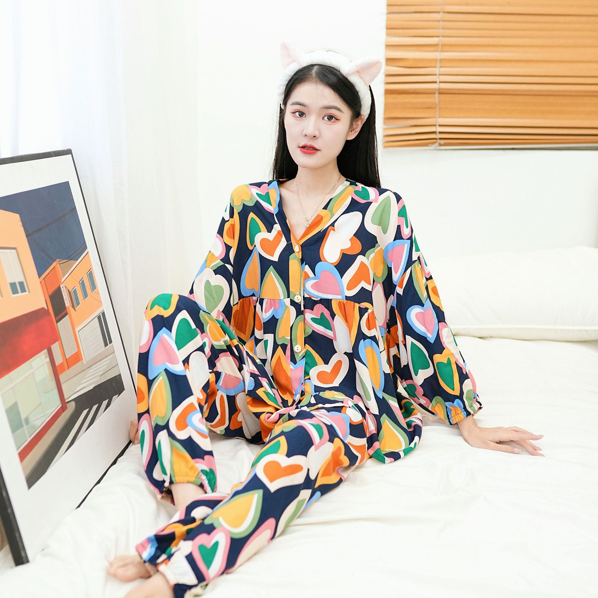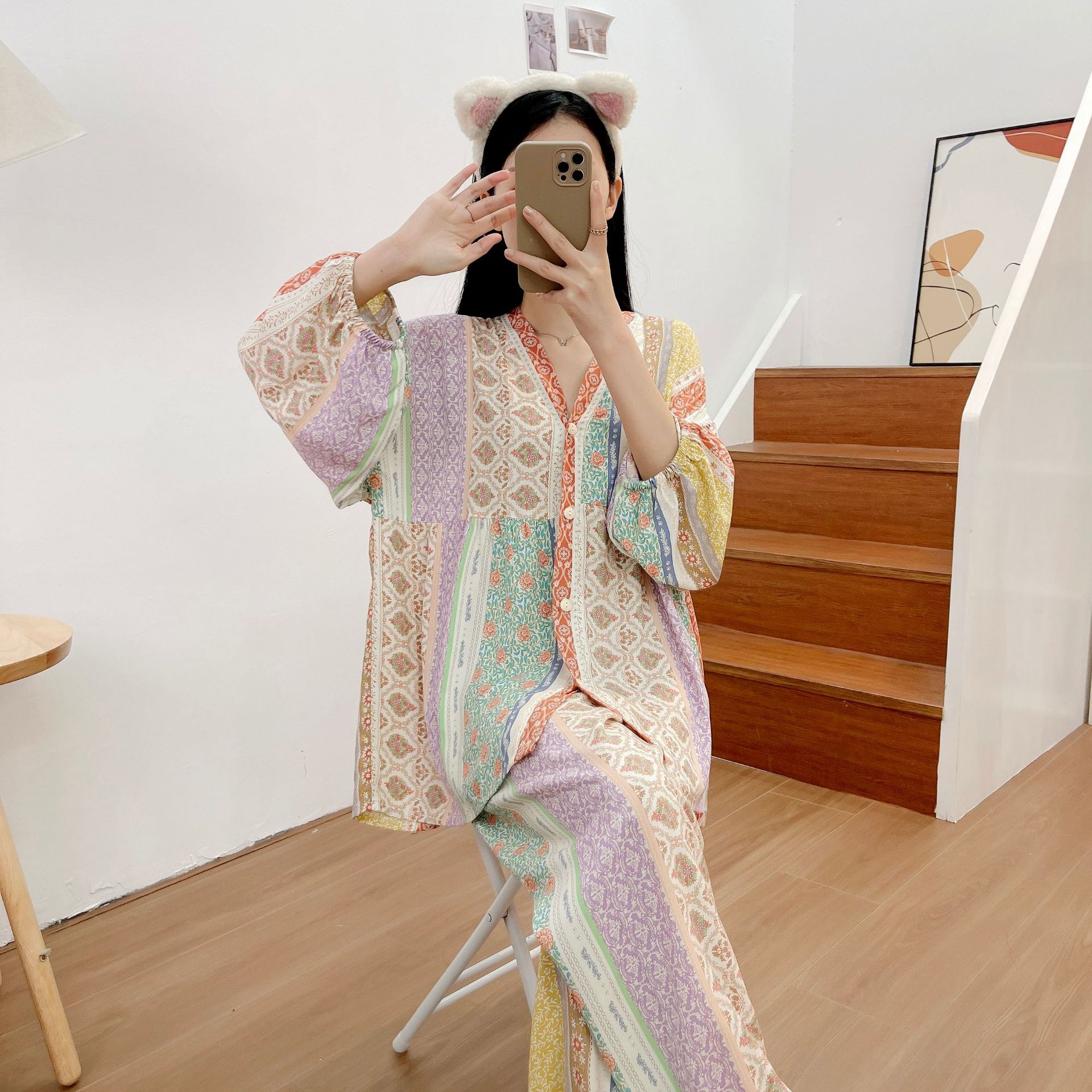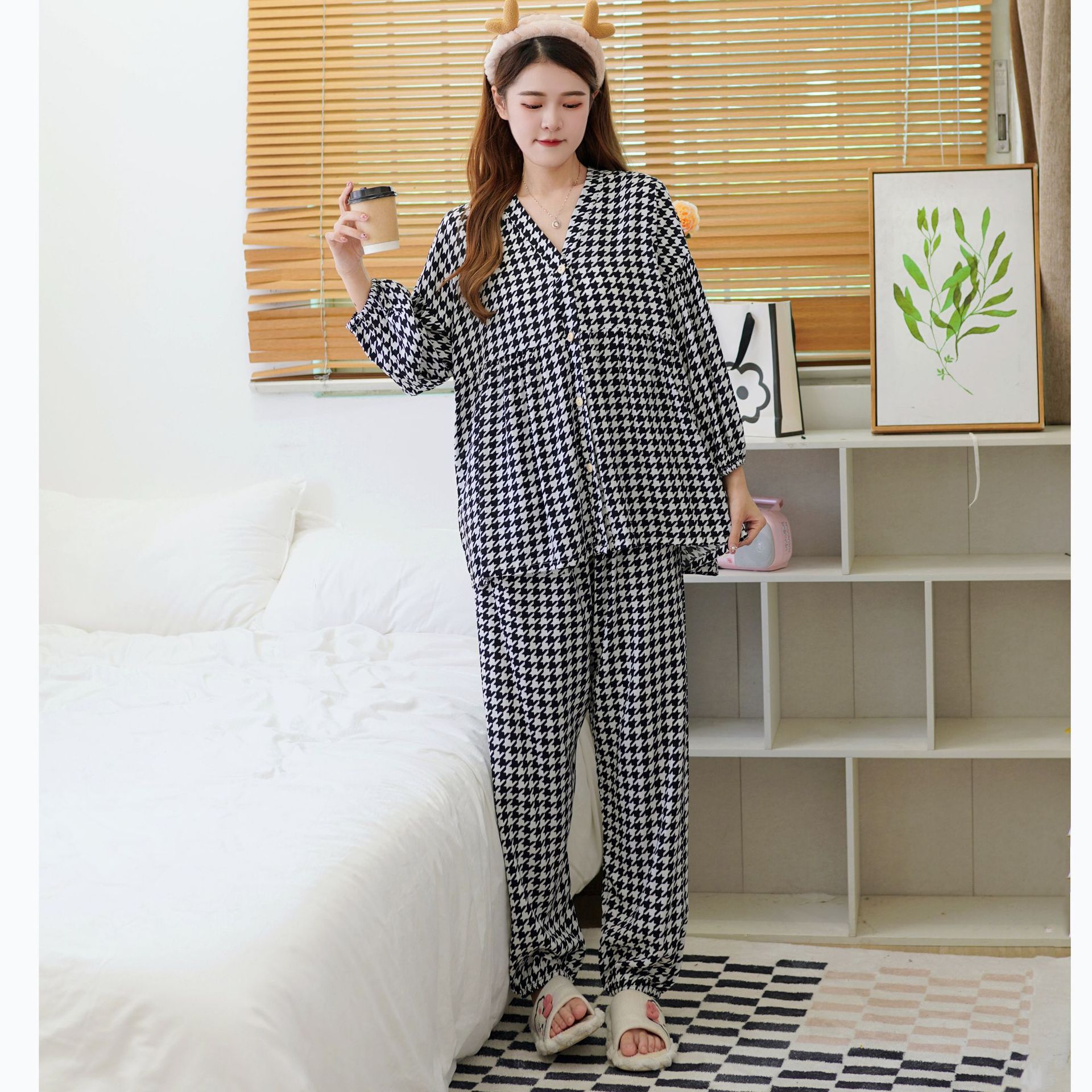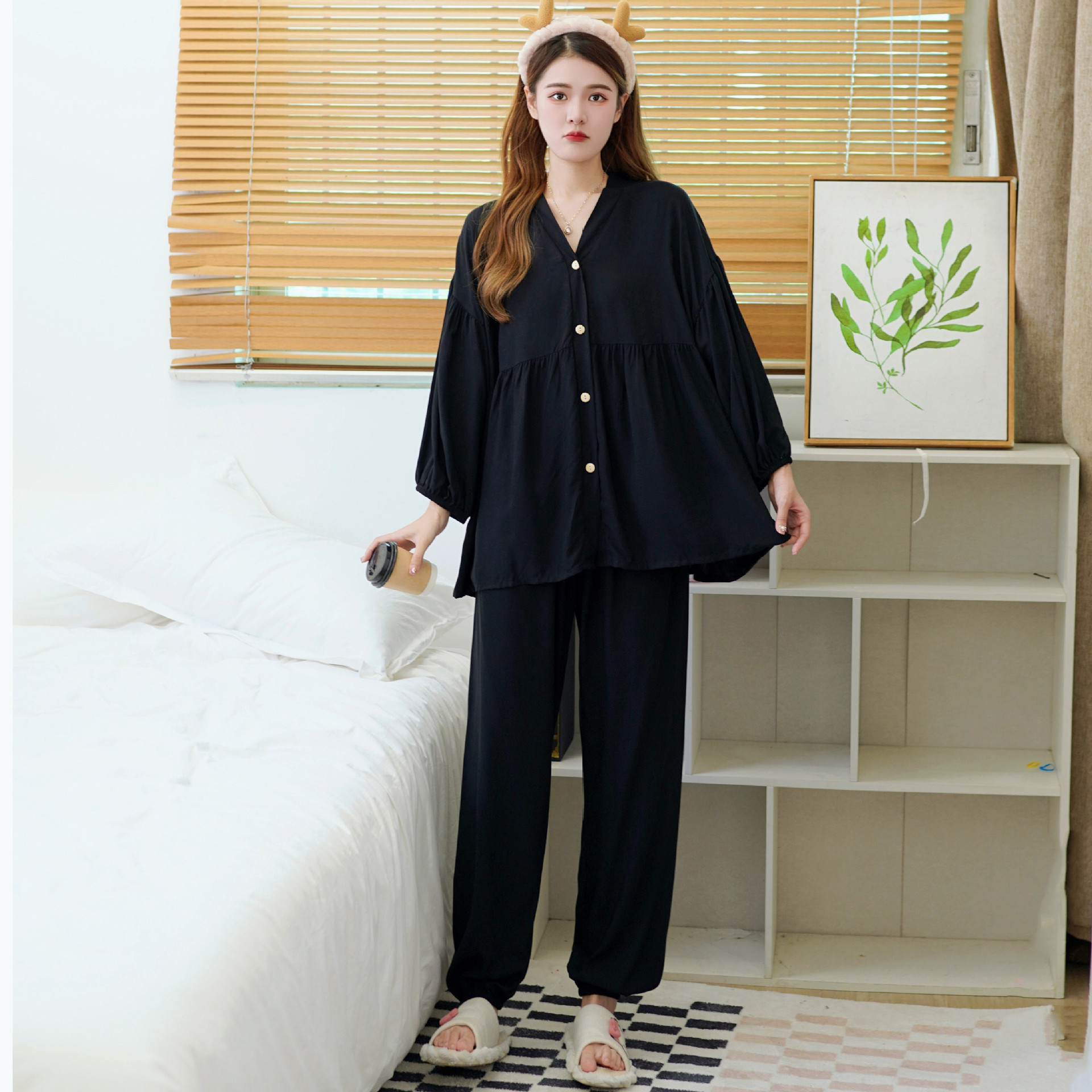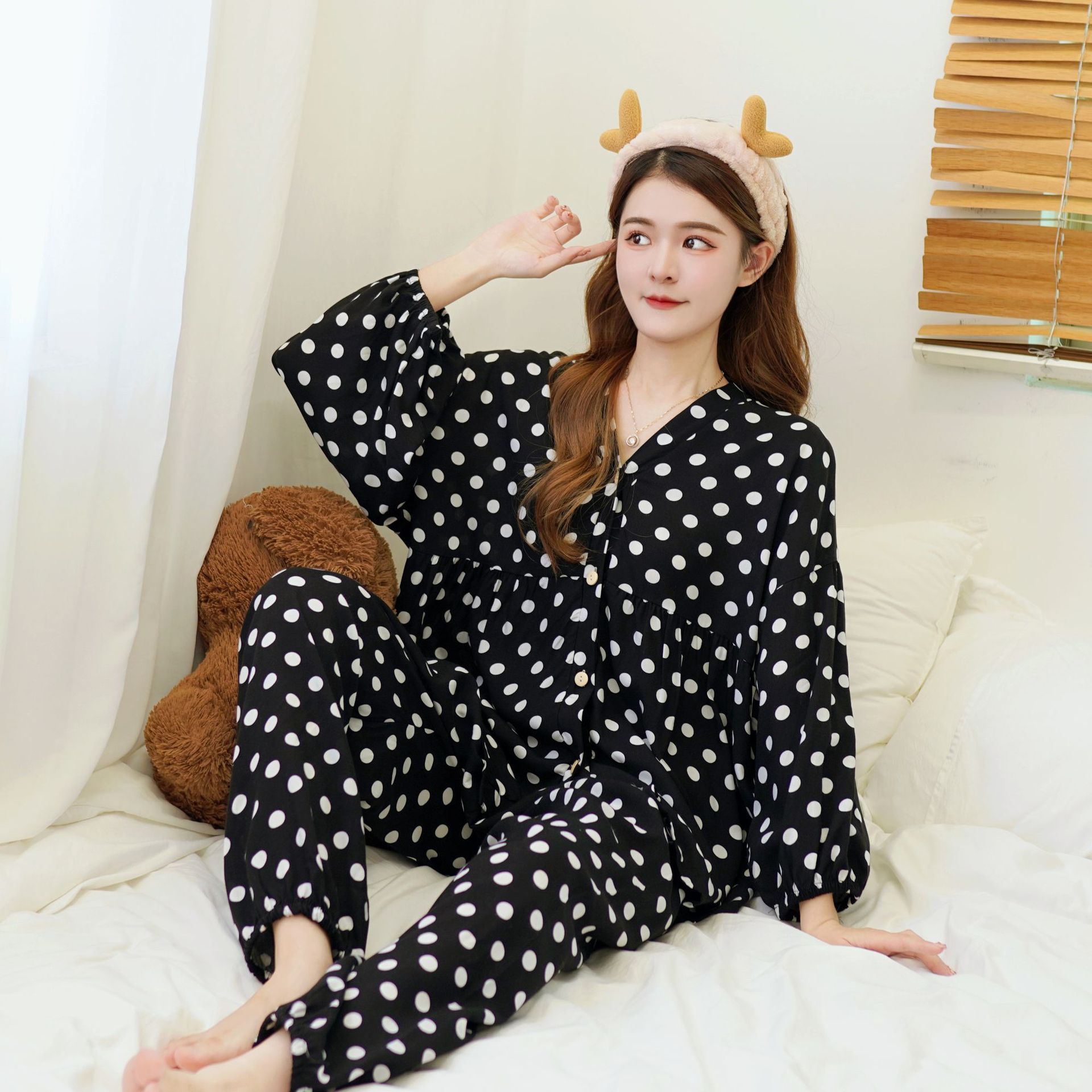 Главная страница > Осенняя новая хлопковая Шелковая пижама, Женский хлопковый Шелковый костюм с укороченным рукавом на пуговицах, корейская мода, большие размеры, домашняя одежда, шаровары