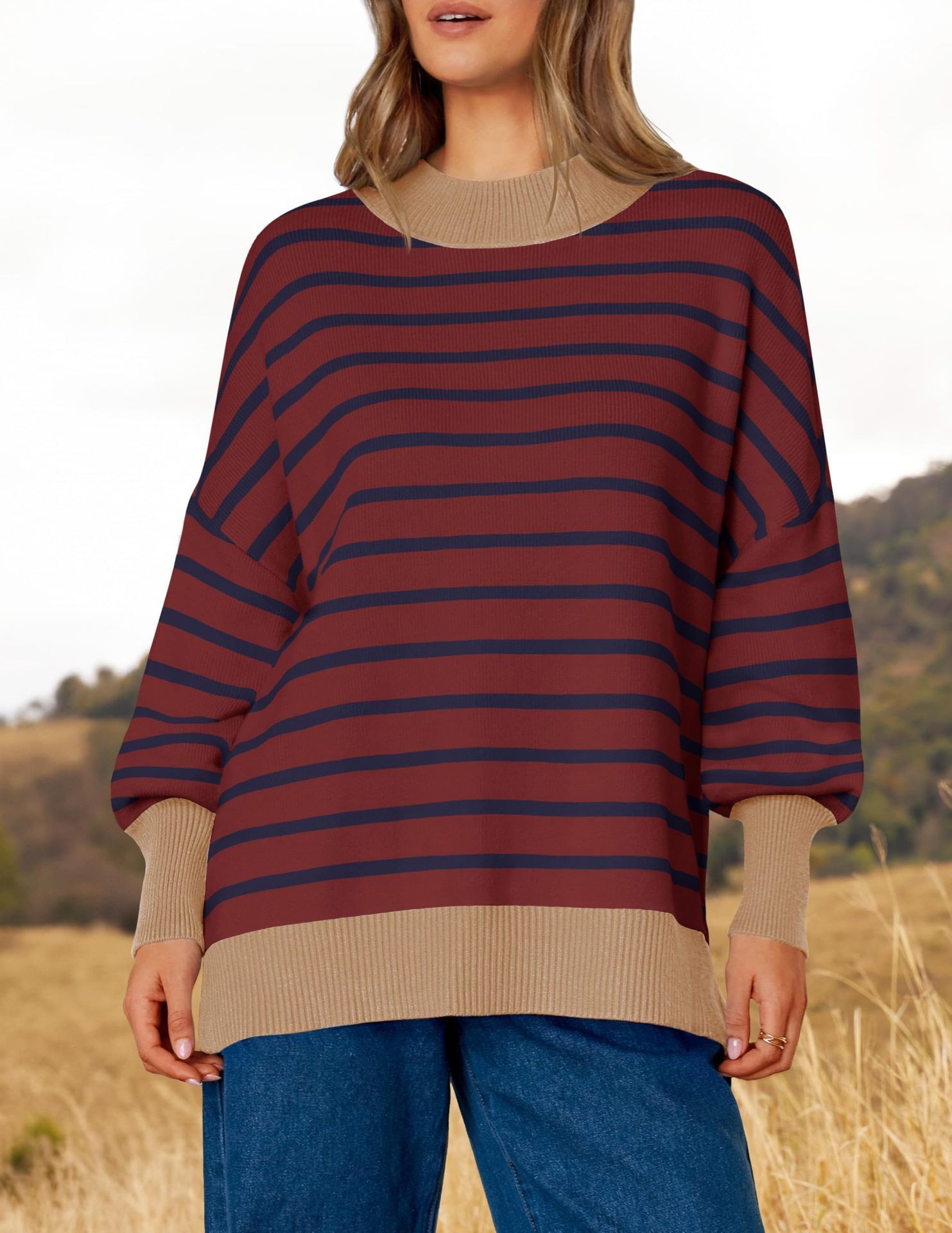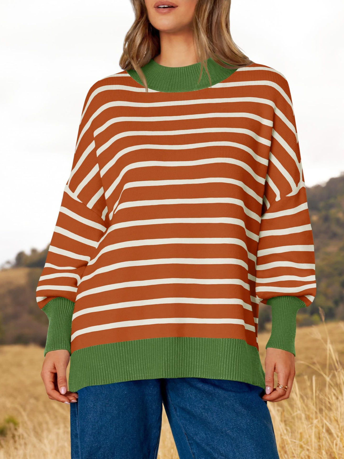 Главная страница > 2024 осень и зима новый трансграничный европейский и американский контрастный круглый воротник в полоску свитер с длинными рукавами свитер женский повседневный свободный свитер