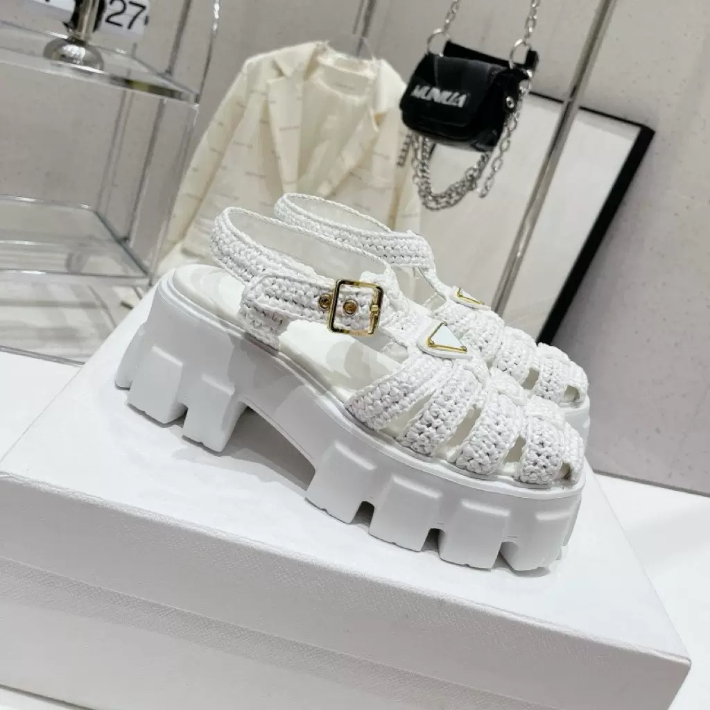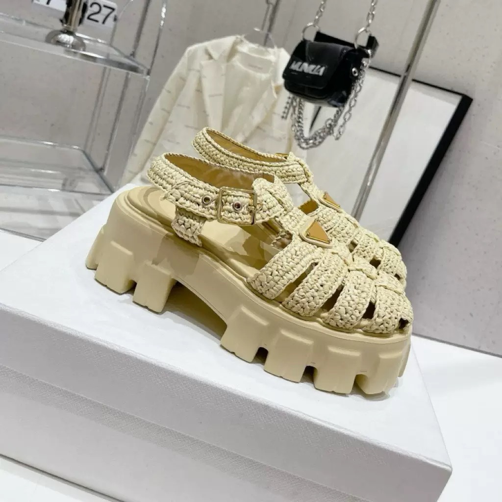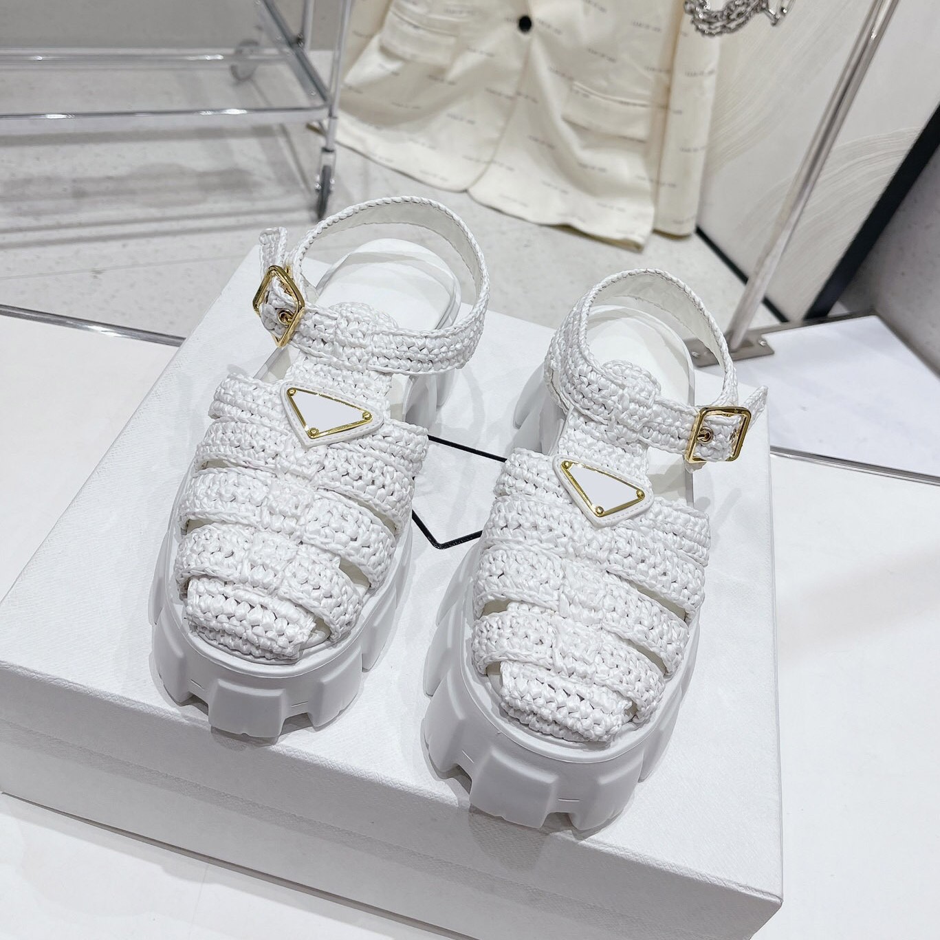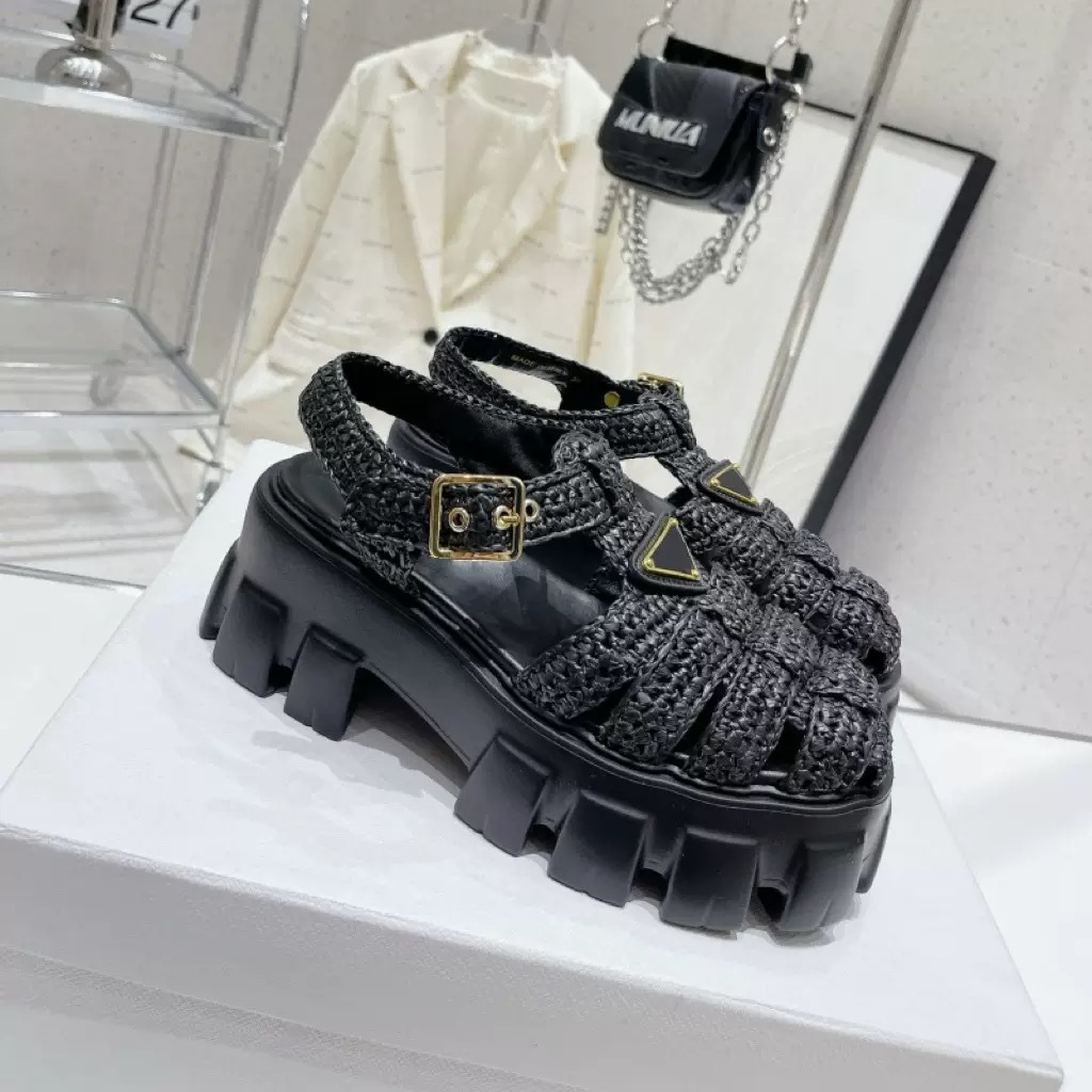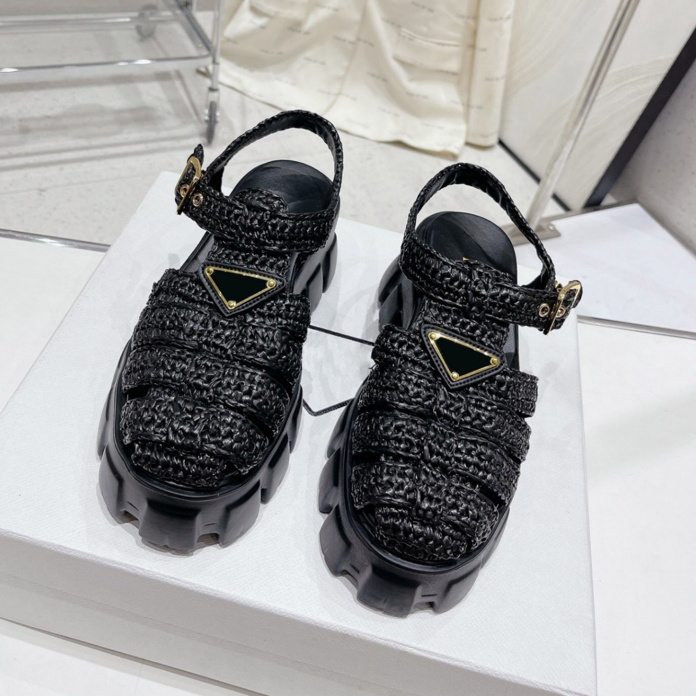 Главная страница > Женские летние сандалии 2025 года, новая модель, треугольный логотип, плетеные, на толстой подошве, ретро, босоножки-баоту, пляжная обувь, на высокой подошве, «свинья в клетке»