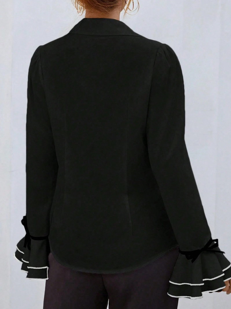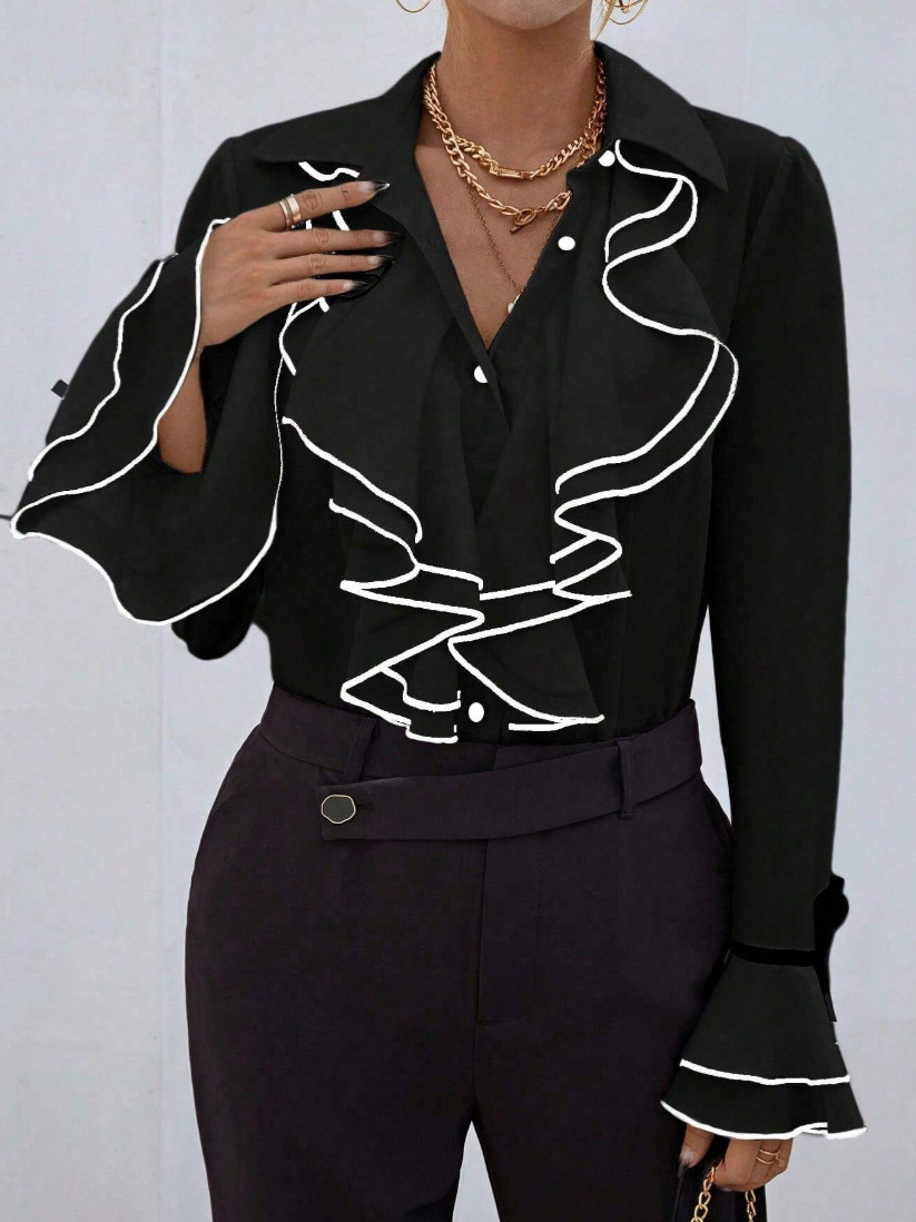 Главная страница > Россия 2025 Европейская и американская трансграничная весенне-осенняя новая женская однотонная французская повседневная рубашка с рюшами и рукавами-колокольчиками