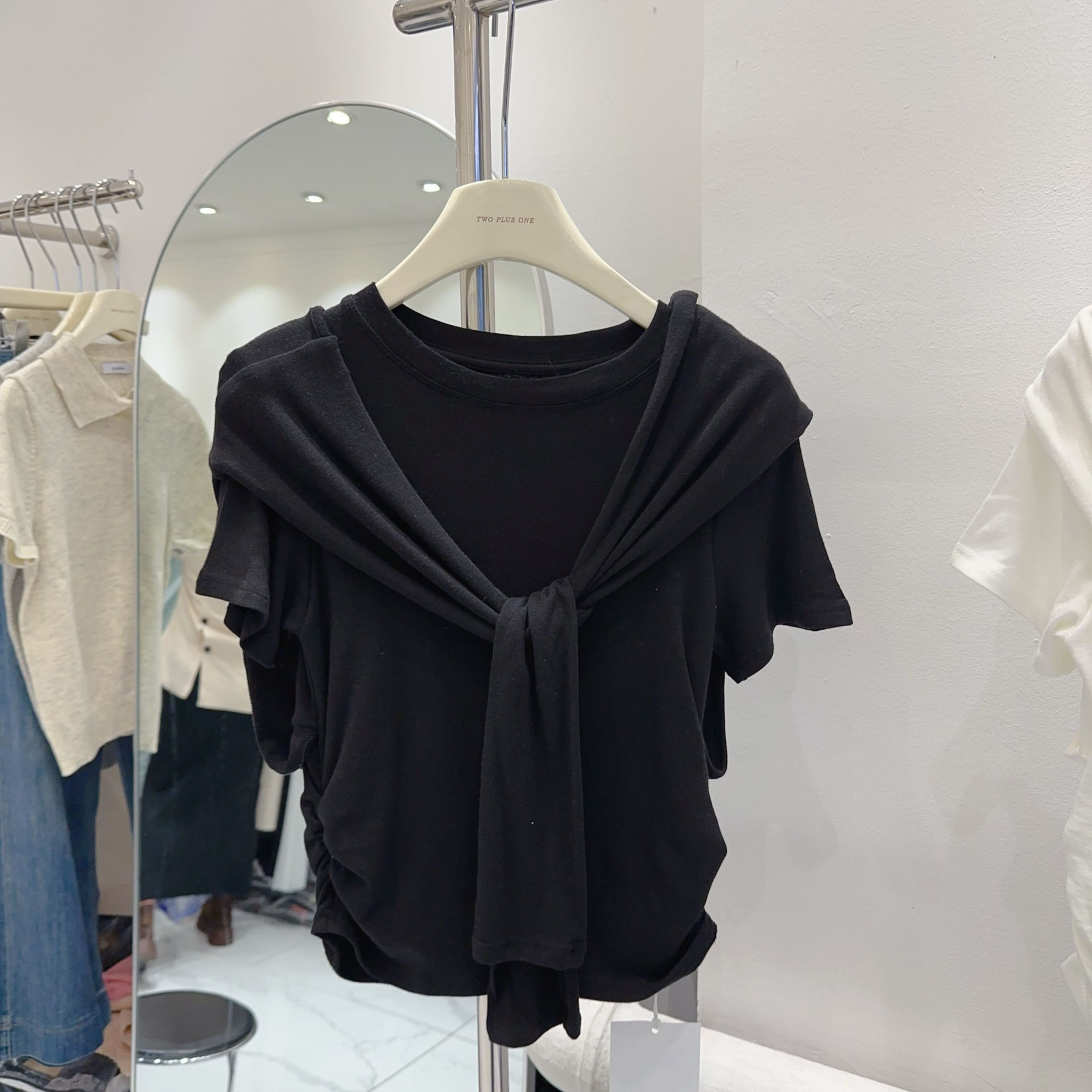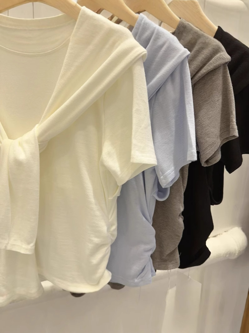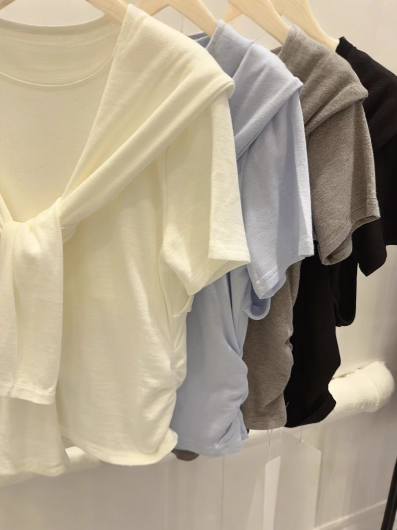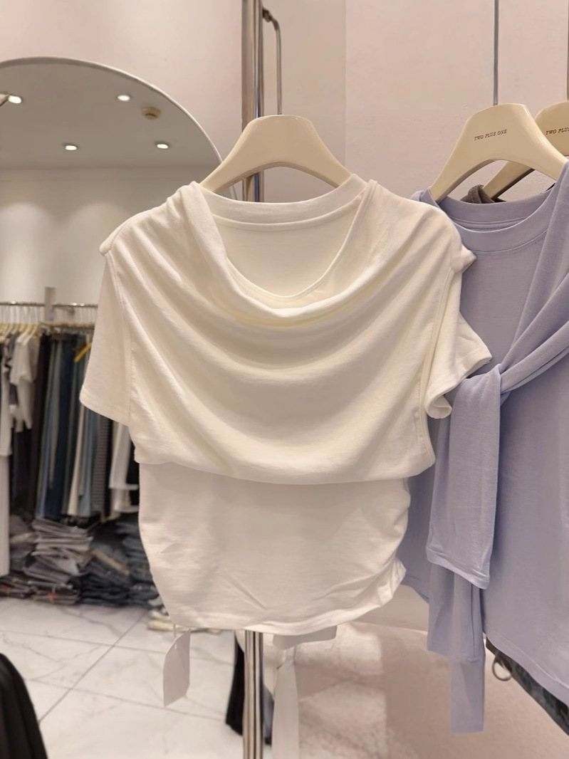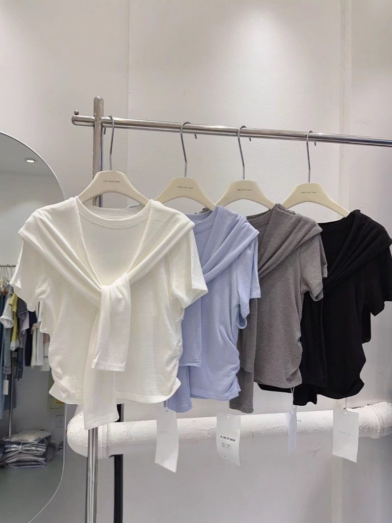 Главная страница > Модальная дизайнерская нишевая шаль, искусственная футболка из двух частей, женские топы с короткими рукавами, уменьшающие возраст, однотонные короткие топы, оптовая продажа