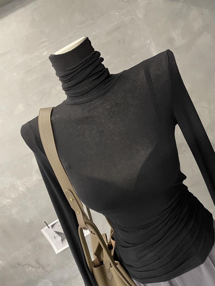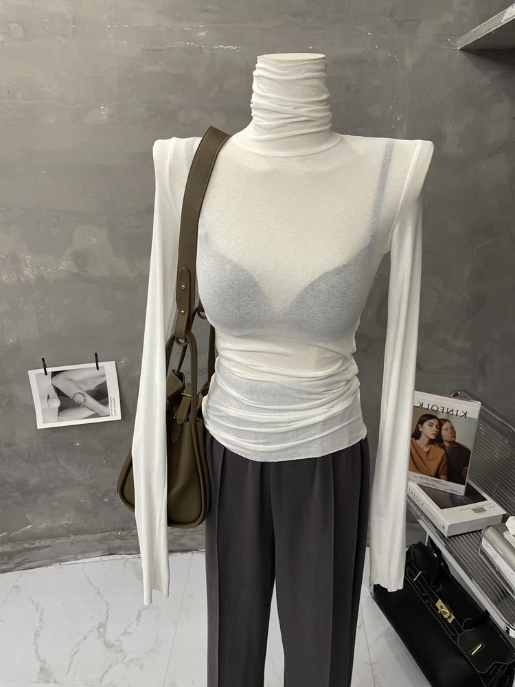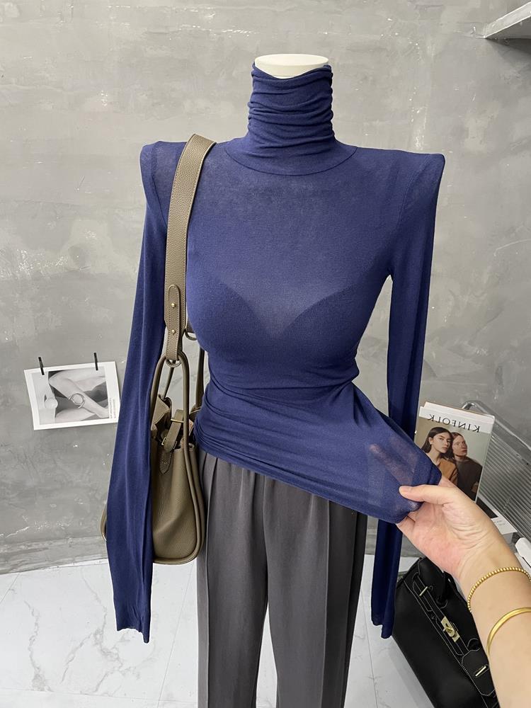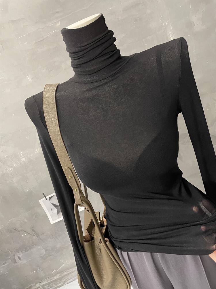 Главная страница > Тонкая слегка прозрачная ~ Базовая нижняя рубашка с воротом, Женская водолазка, футболка с длинным рукавом, однотонный облегающий внутренний топ, осень