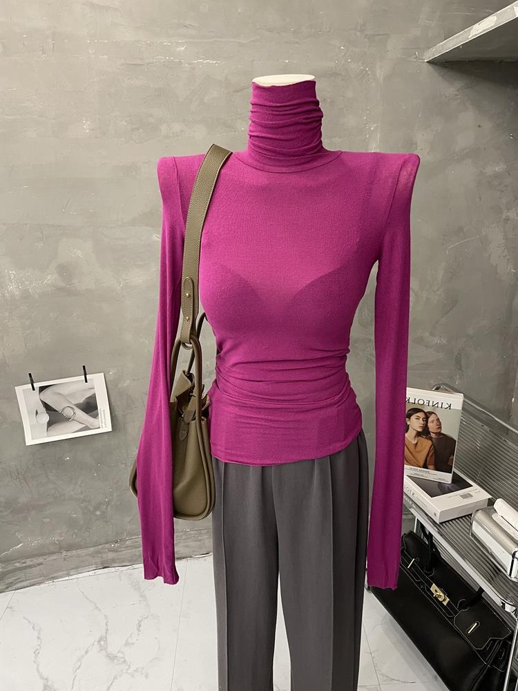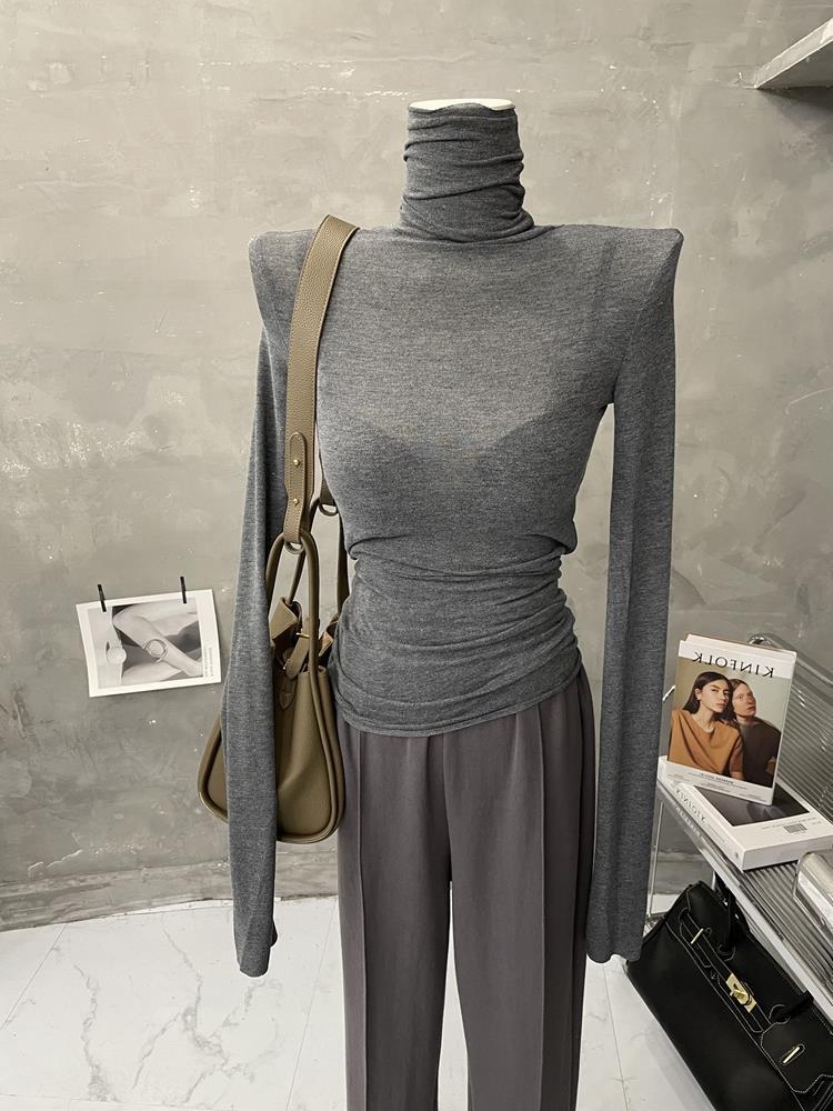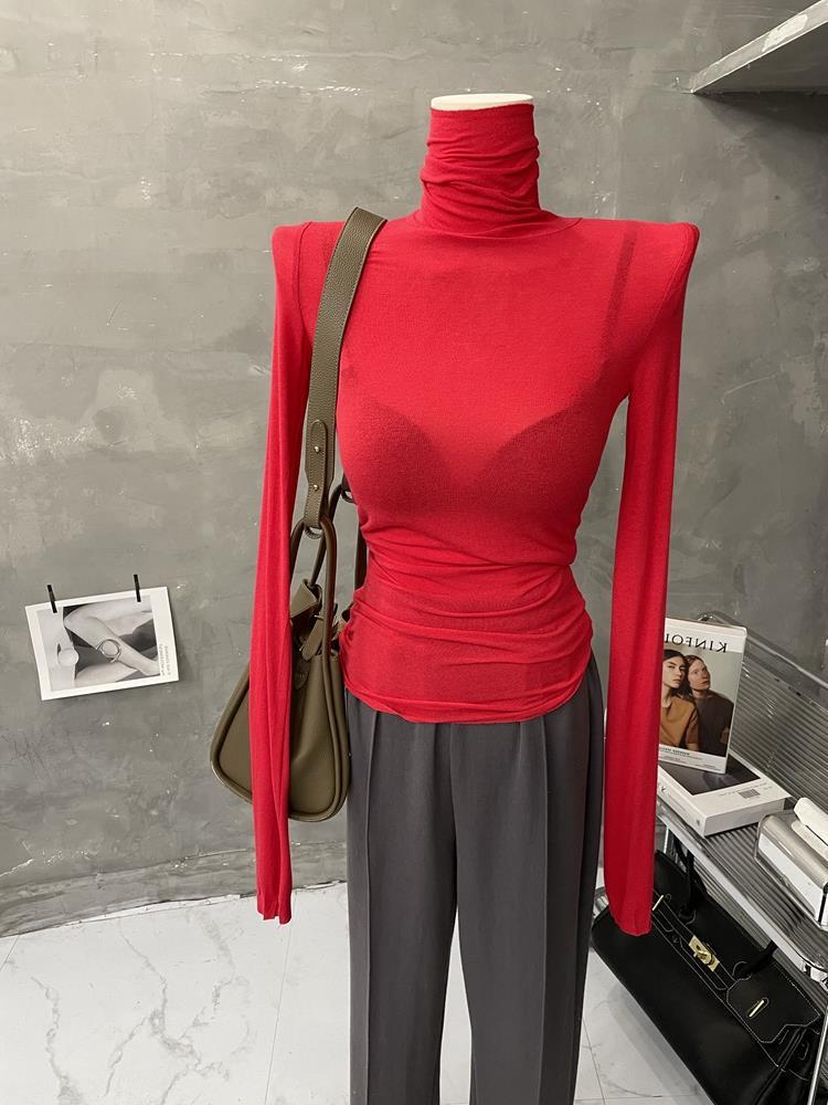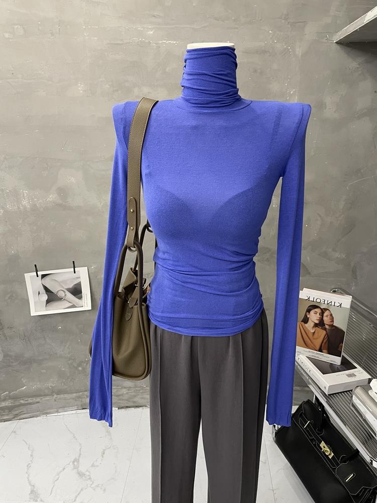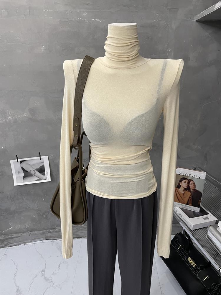 Главная страница > Тонкая слегка прозрачная ~ Базовая нижняя рубашка с воротом, Женская водолазка, футболка с длинным рукавом, однотонный облегающий внутренний топ, осень