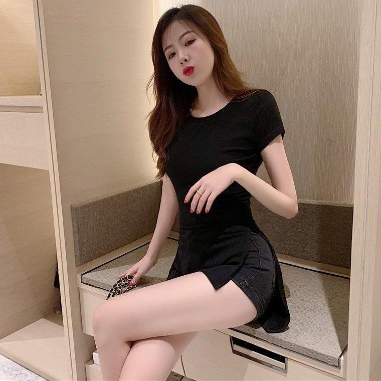 Главная страница > Новая облегающая привлекательная футболка с разрезом в Корейском стиле, Женская Однотонная футболка средней длины с короткими рукавами и круглым вырезом, лето 2020