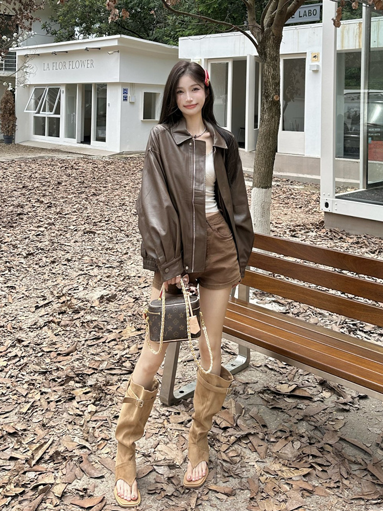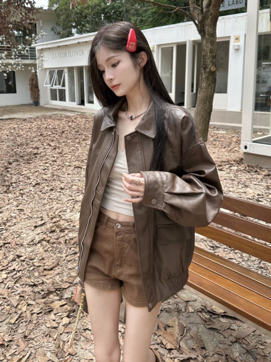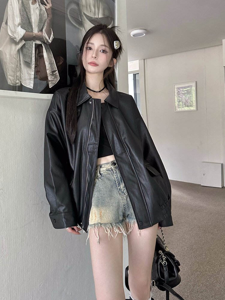 Главная страница > Ретро американский цвет карри кожаная куртка куртка женская осень черный сладкий прохладный ветер мотоцикл PUpo свободный топ с длинными рукавами