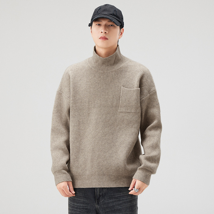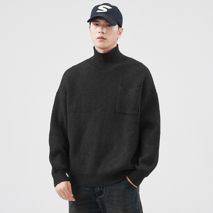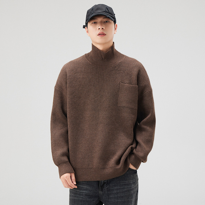 Свитер с полувысоким воротником мужской осенний и зимний новый карманный сплошной цвет японский ретро свитер средний воротник пуловер