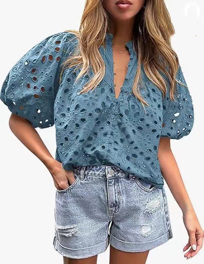 Главная страница > 2024 трансграничный женский летний топ модный повседневный рукав фонарь с V-образным вырезом на пуговицах с кружевной вышивкой рубашка