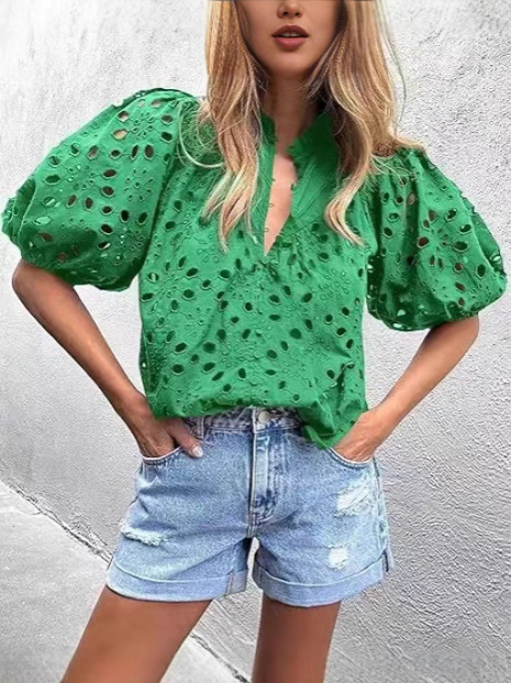 2024 трансграничный женский летний топ модный повседневный рукав фонарь с V-образным вырезом на пуговицах с кружевной вышивкой рубашка
