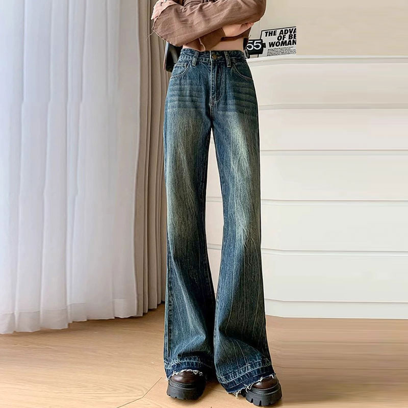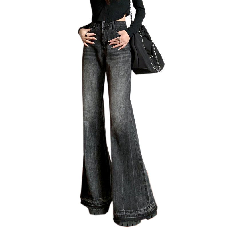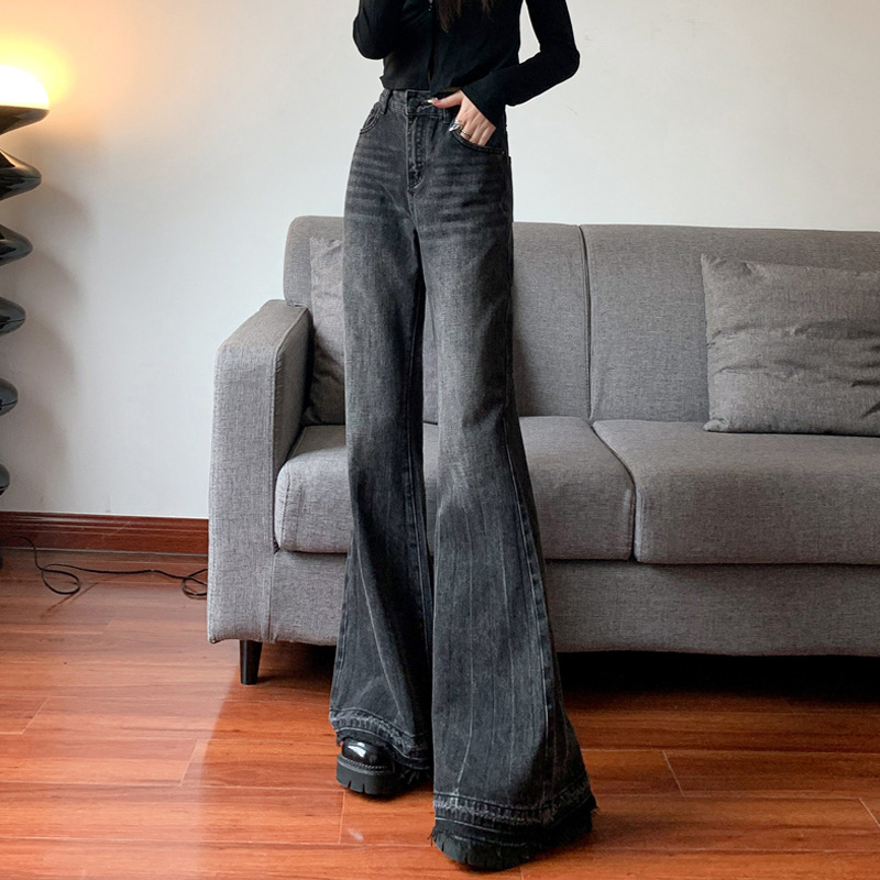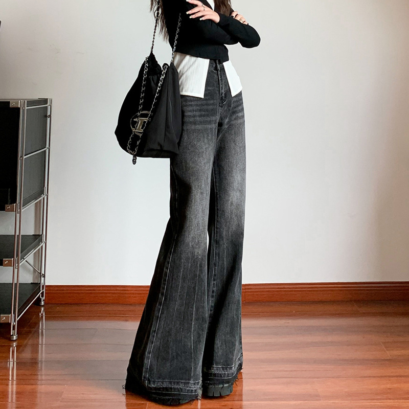 Главная страница > Женские расклешенные джинсы, зауженный крой, большие размеры, широкие брюки, большой размер, черные и серые, с высокой талией, прямые, расклешенные, с рваным краем