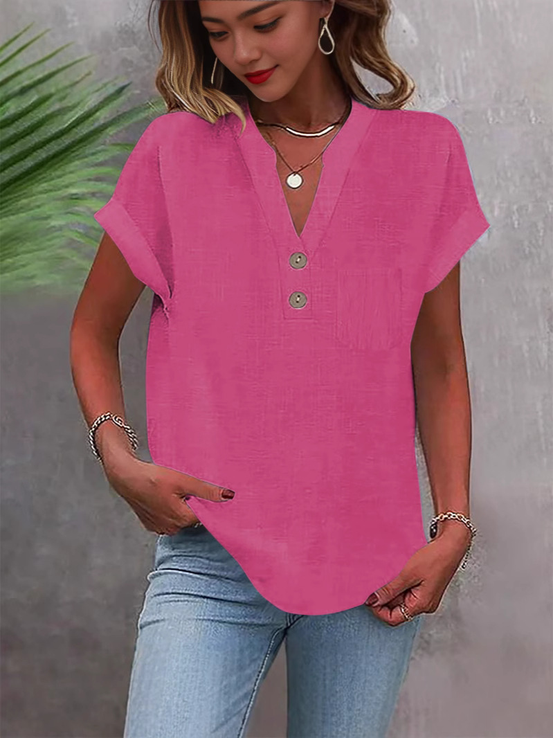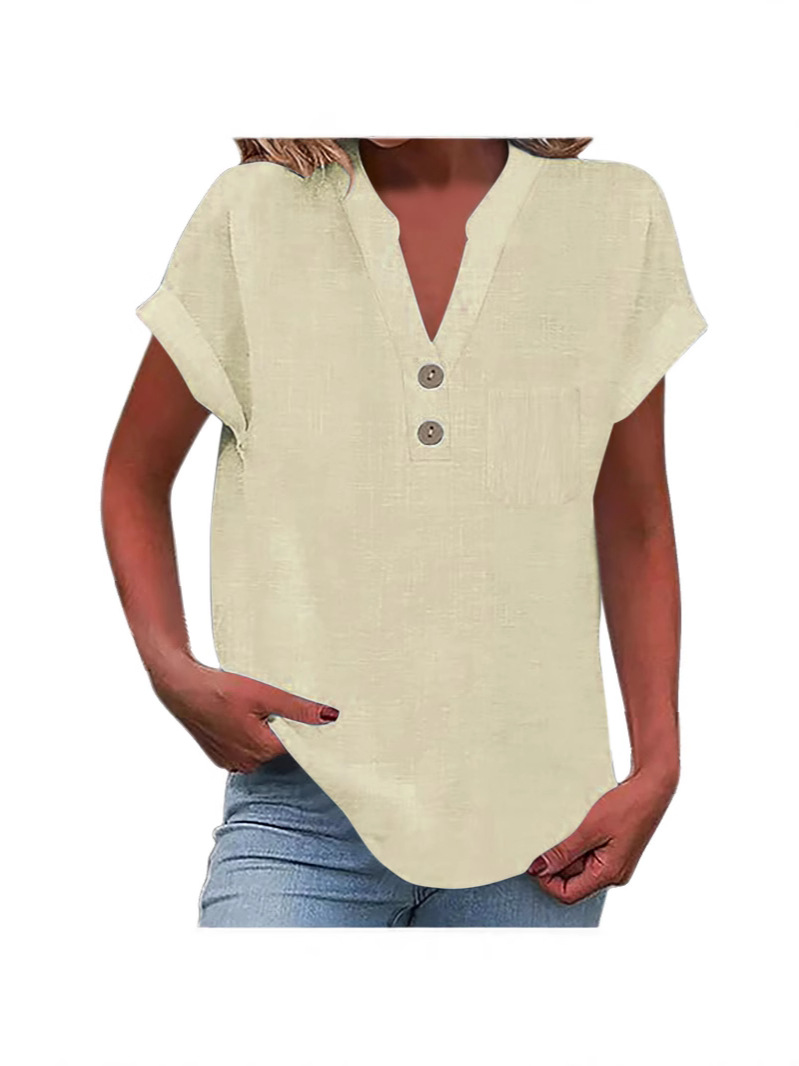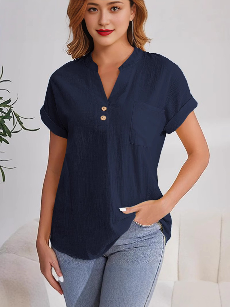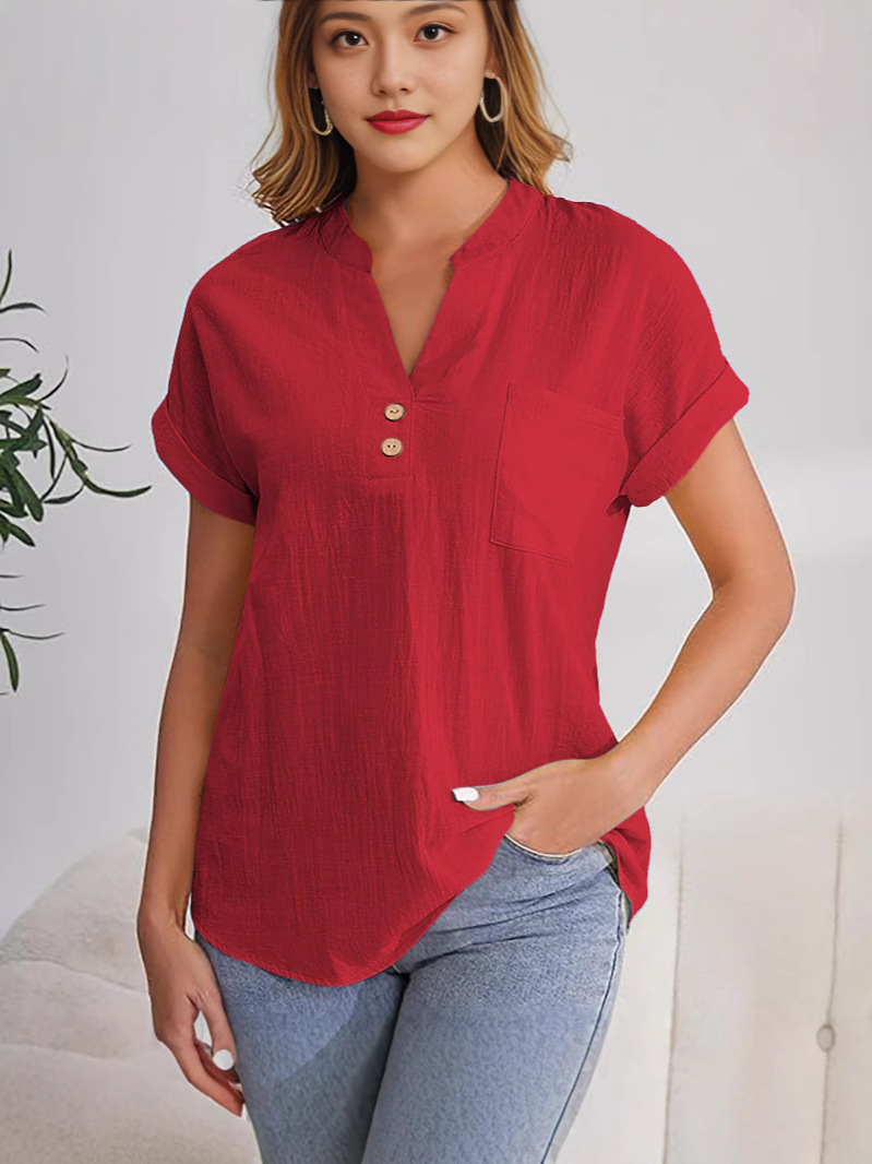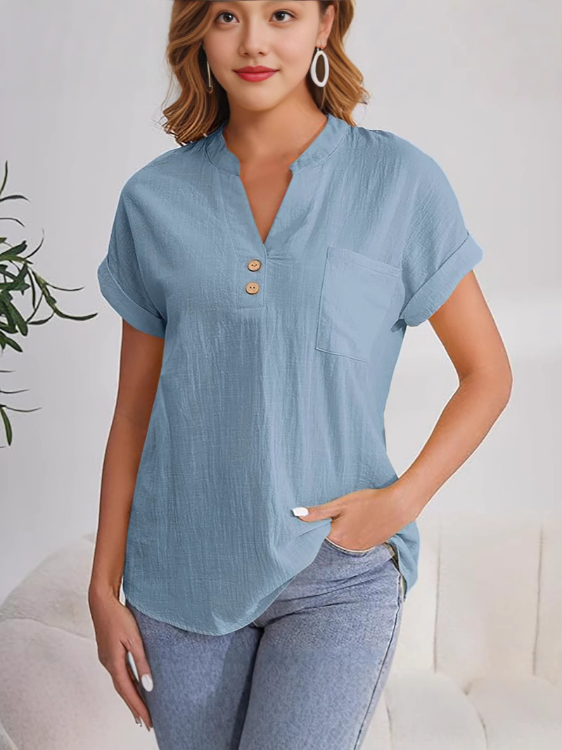 Главная страница > Женская рубашка с коротким рукавом на пуговицах, однотонная, летняя, 2025 год, европейский и американский стиль, хлопок-лен, немнущаяся, дышащая, с V-образным вырезом, модная, универсальная