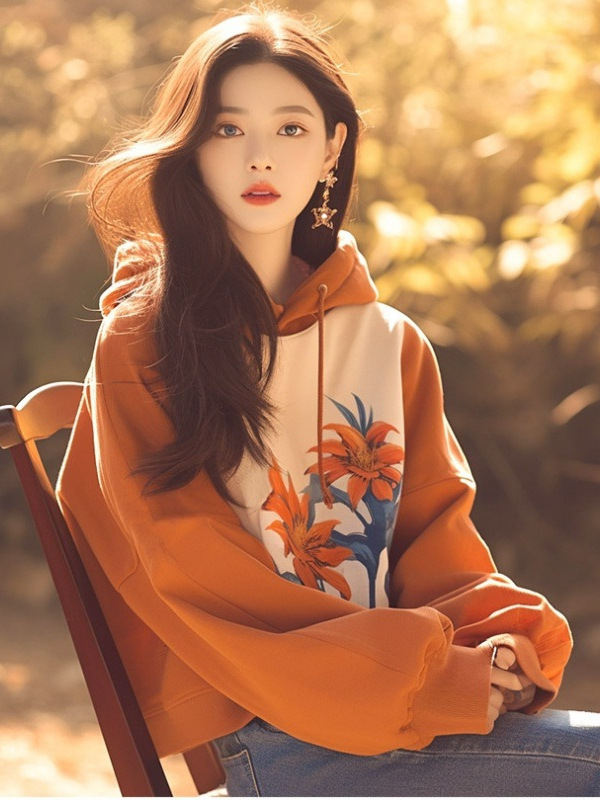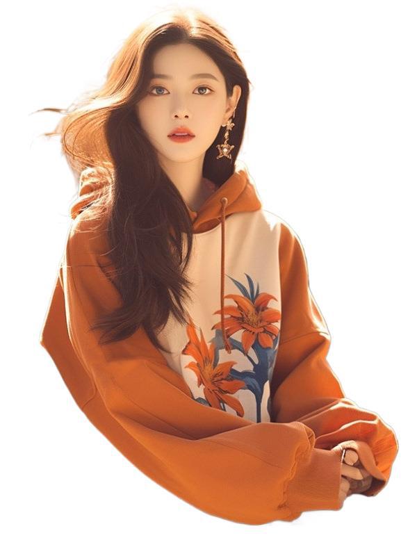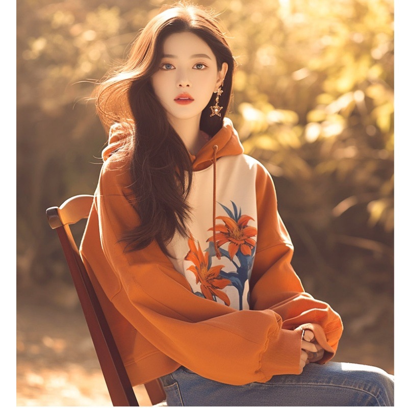 Главная страница > Оранжевый свободный женский свитшот с капюшоном и принтом, осень 2024, новый дизайн, нишевый пуловер, топ
