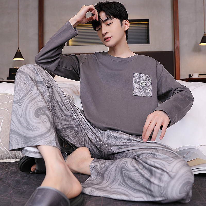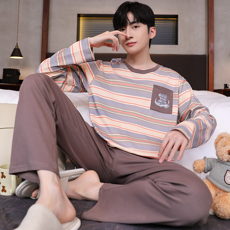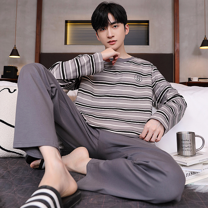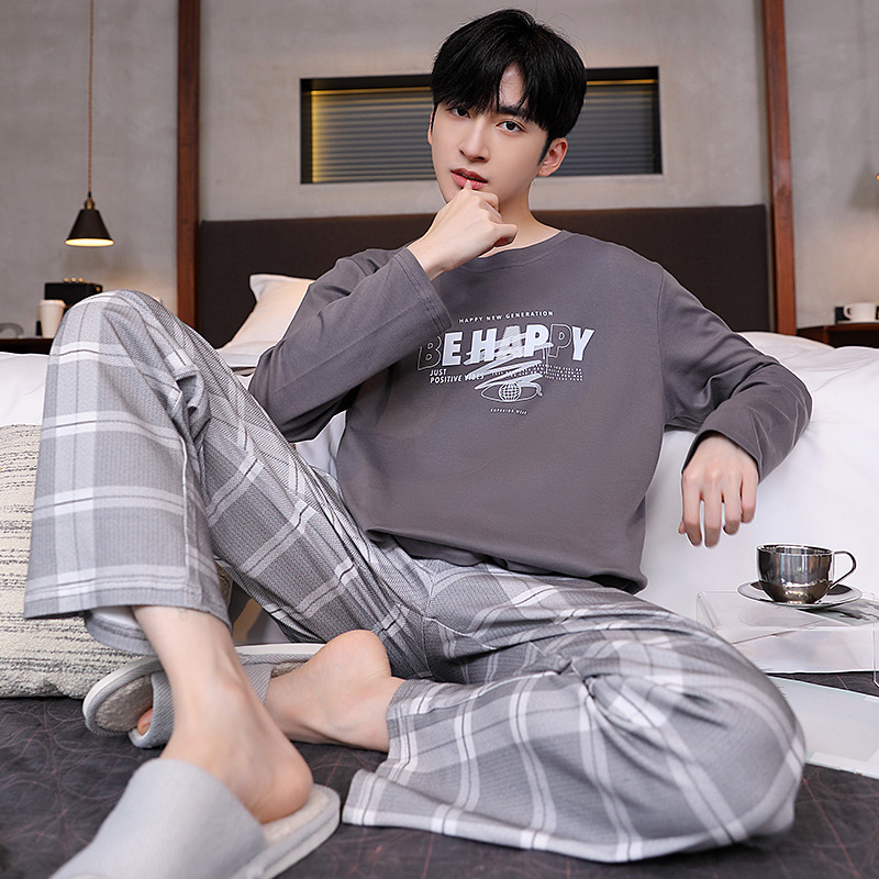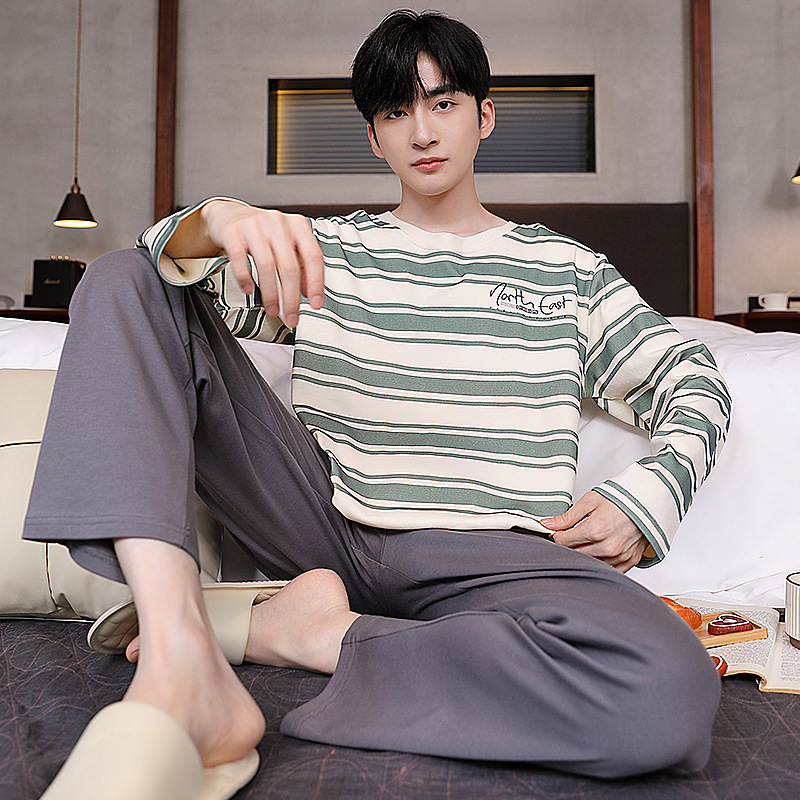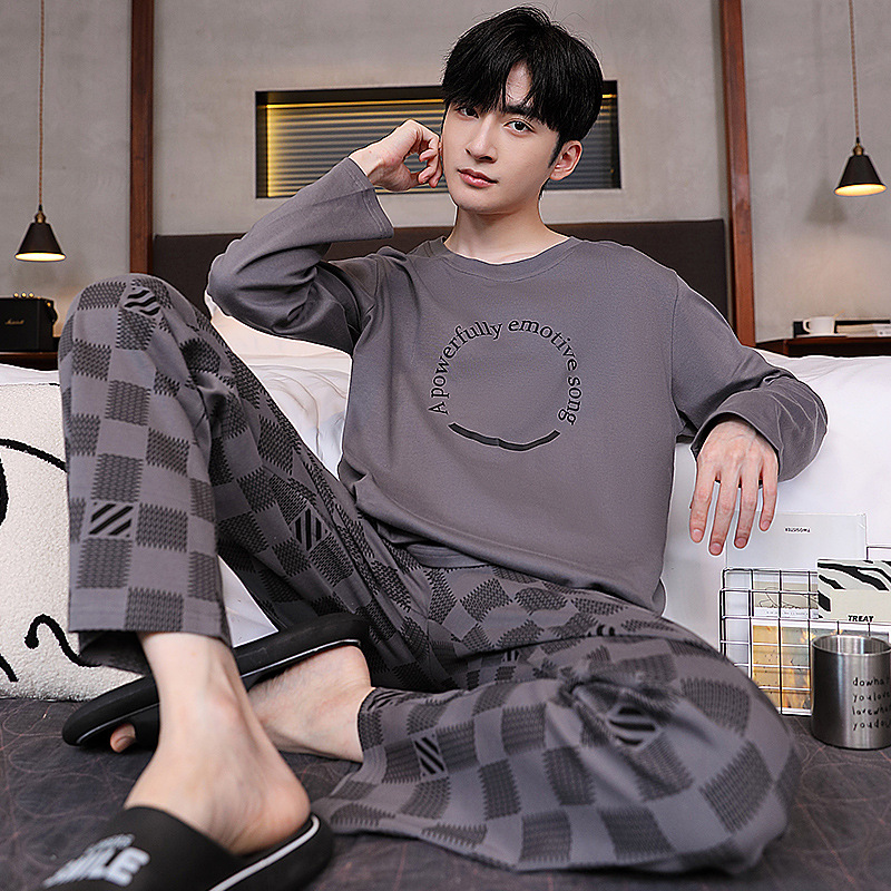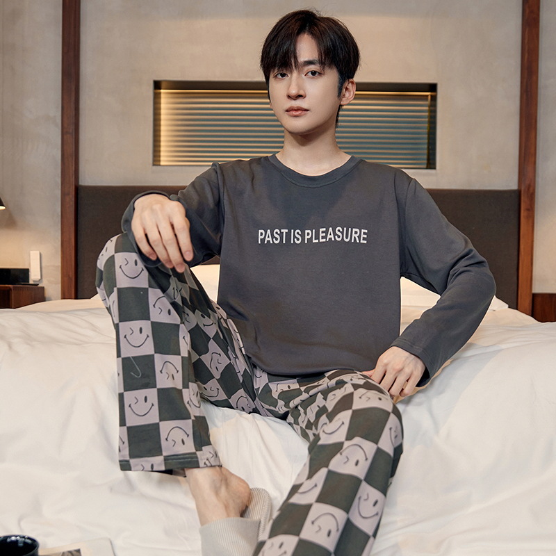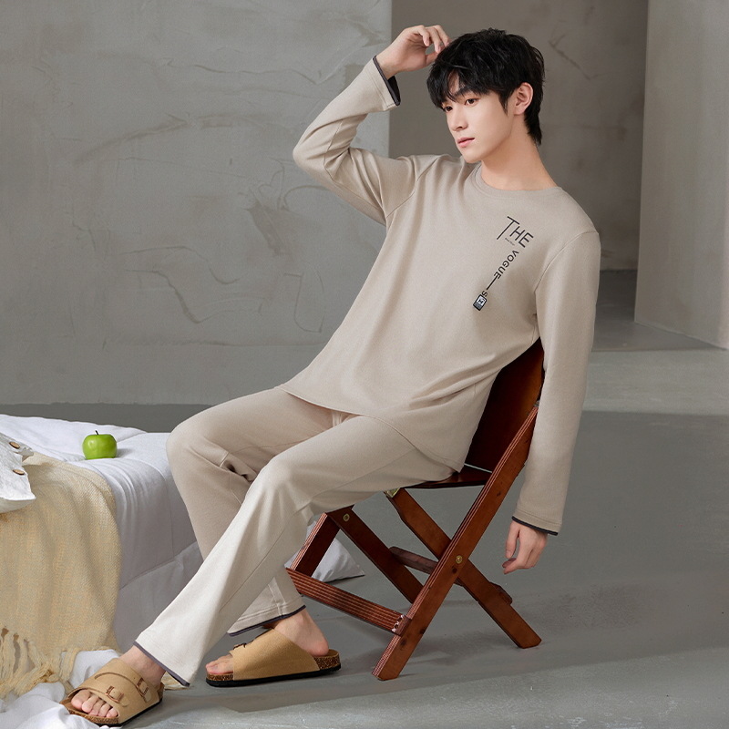 Главная страница > Мужские пижамы из 100% хлопка, весенне-осенние, из чистого хлопка, с длинными рукавами, с круглым вырезом, повседневные, мягкие, приятные к коже, можно носить на улице, полный комплект домашней одежды из хлопка.