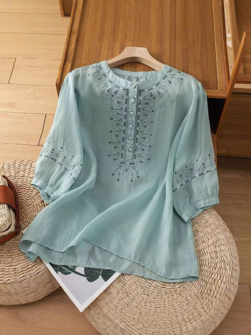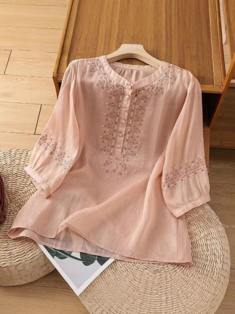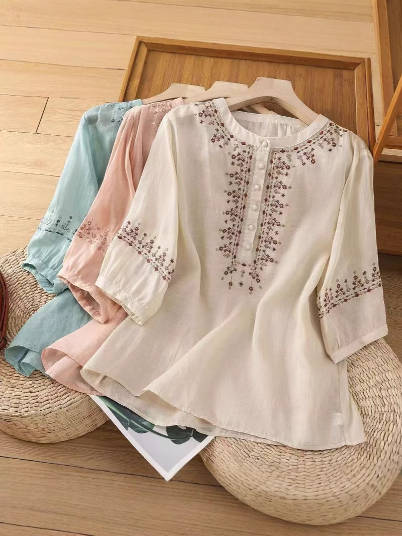 Новинка лета 2025 года, рубашка из хлопка и льна, женский пуловер в стиле ретро с ромбовидной вышивкой, темпераментный повседневный пуловер, рубашка