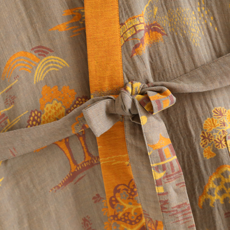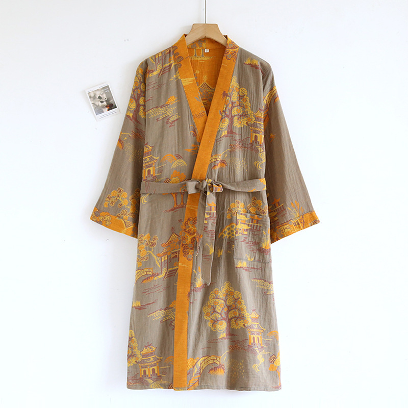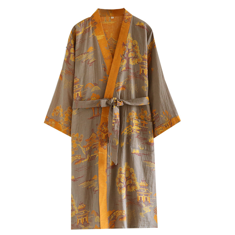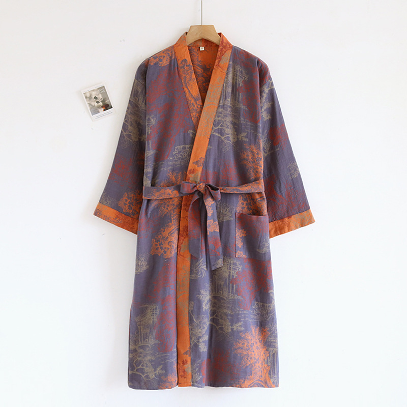 Главная страница > Мужская ночная рубашка из чистого хлопка с жаккардовым узором Four Seasons и поясом, свободная пижама средней длины в японском стиле, паровой костюм