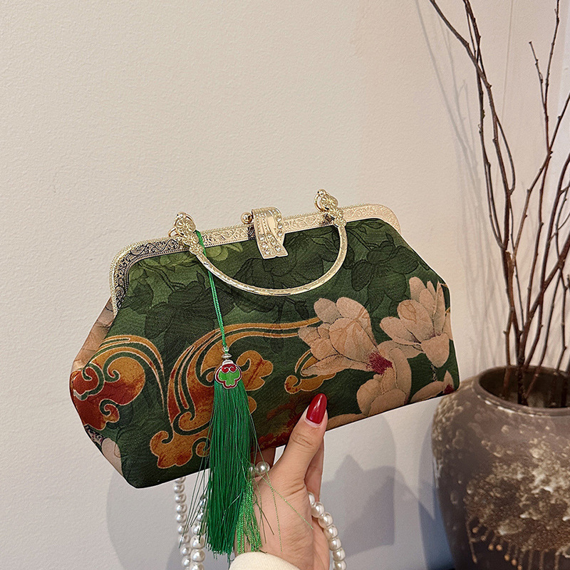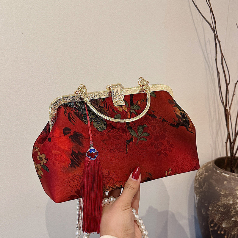 Главная страница > Трансграничная фабричная сумка в китайском стиле с шелковой поверхностью, элегантная сумка в древнем стиле, художественная сумка Cheongsam, ручная сумка через плечо с жемчугом и клипсой