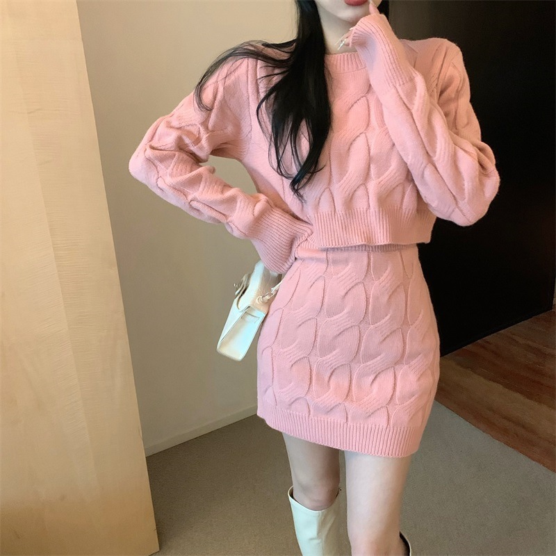Главная страница > Комплект из вязаного свитера с узором "твист" 2024 года, в стиле "ленивый" кэжуал, с утолщенной юбкой, женский, облегающий, с длинными рукавами, высокой талией, короткая юбка-миди, комплект из двух предметов.