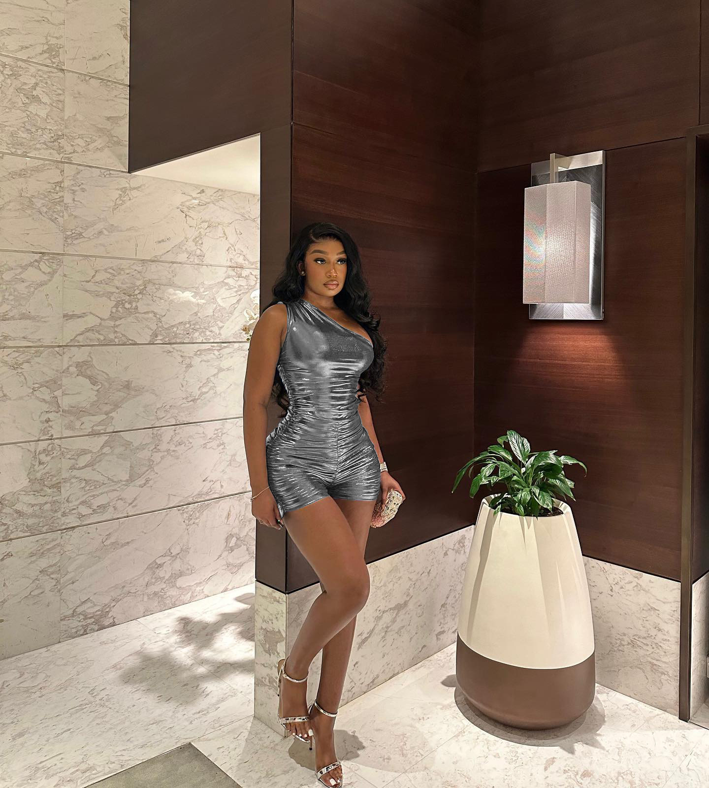 5566 Европейская и американская женская одежда Amazon Independent Station Металлический легкий плиссированный комбинезон с косыми плечами Шорты