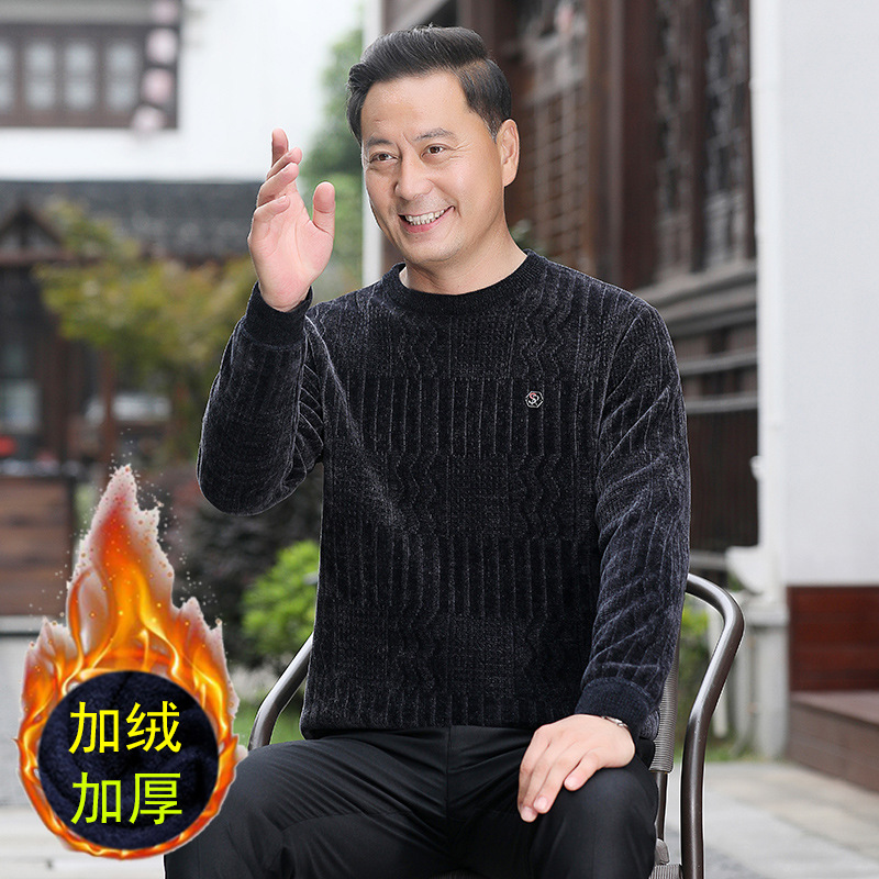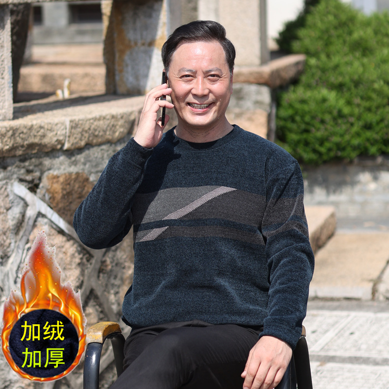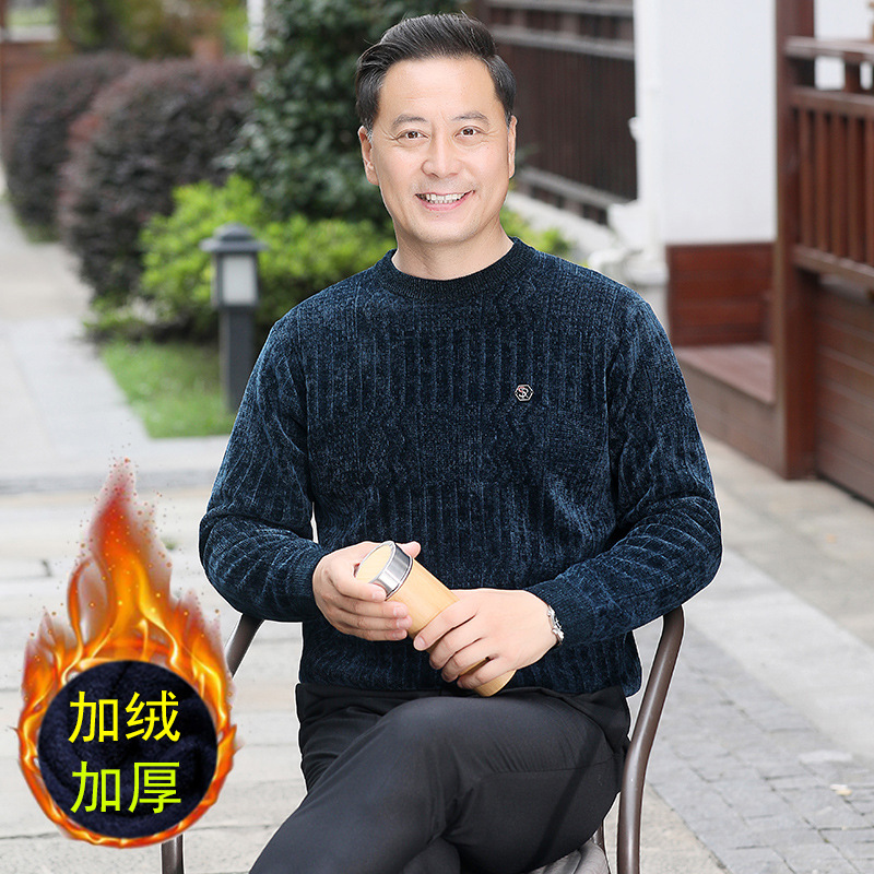 Свитер из синели для папы среднего возраста, мужская осенне-зимняя цельная утепленная вязаная рубашка на флисовой подкладке, базовая теплая одежда
