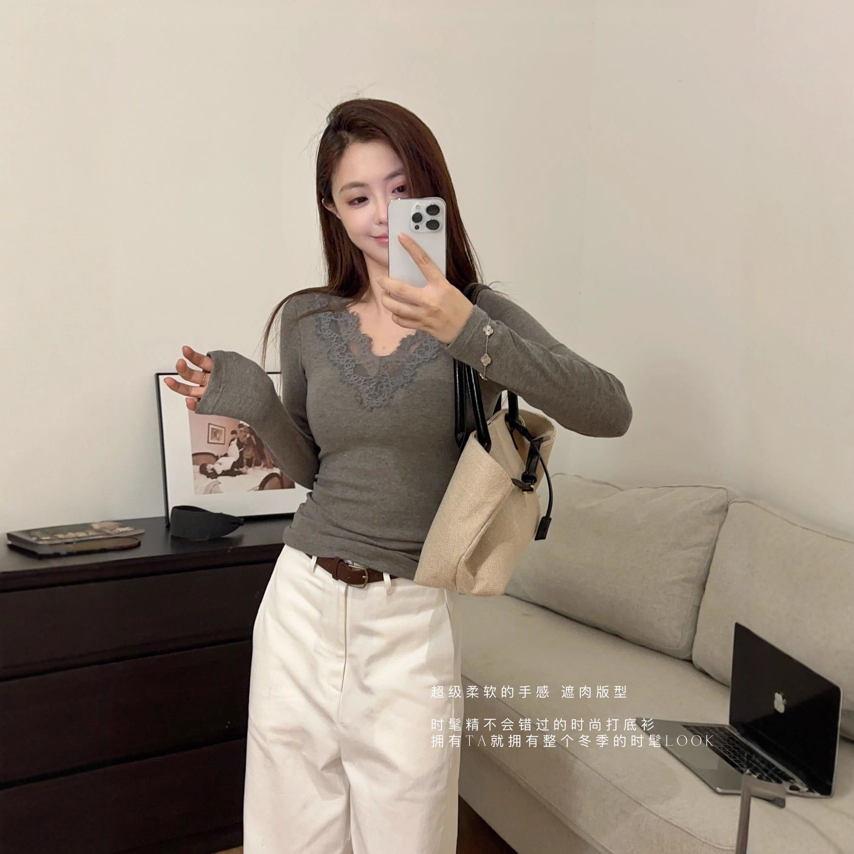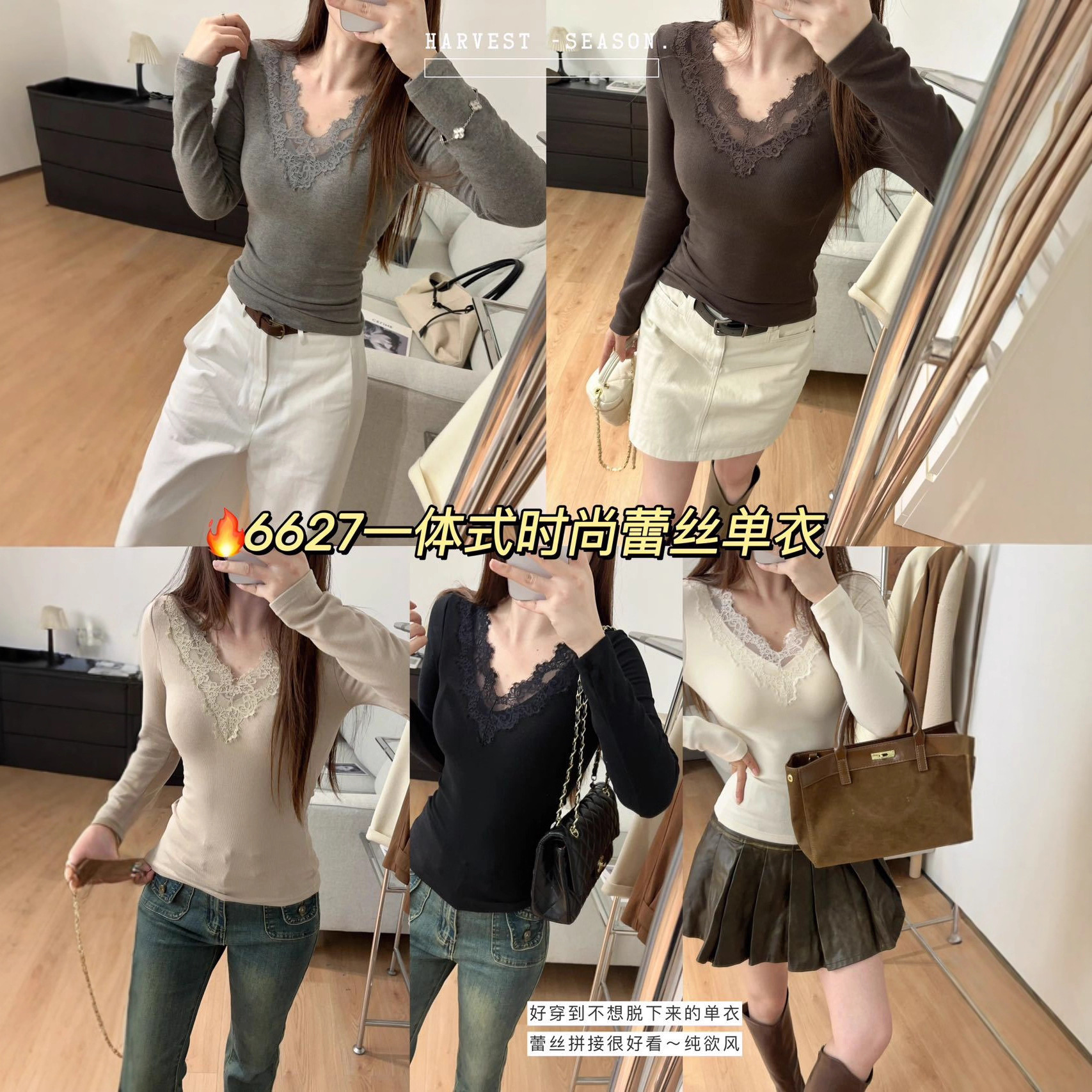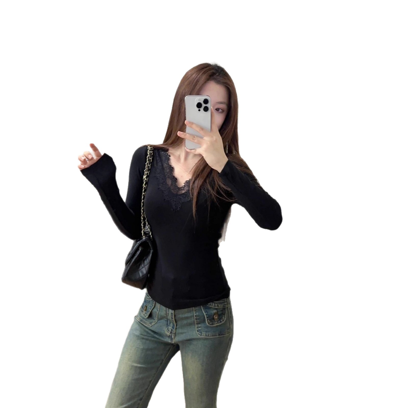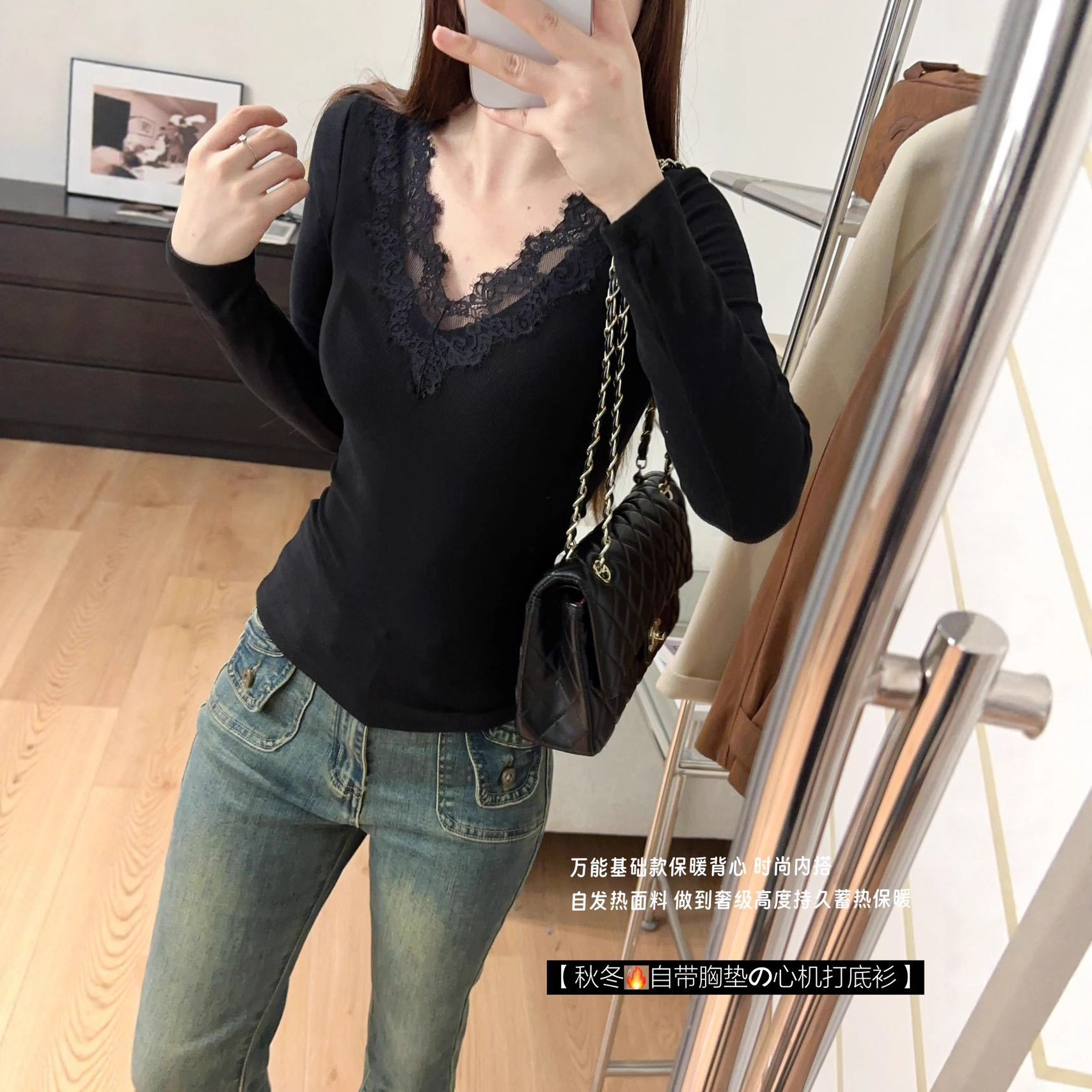 Главная страница > Новая осенне-зимняя модная кружевная блузка с V-образным вырезом и встроенным бюстгальтером, цельный базовый слой, утягивающий, для осени и зимы. # 6627
